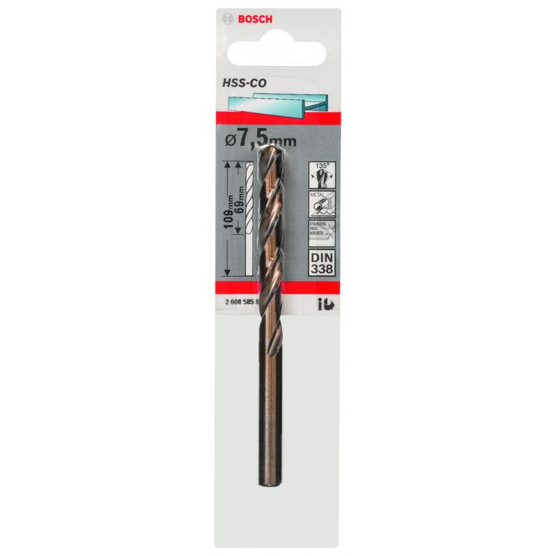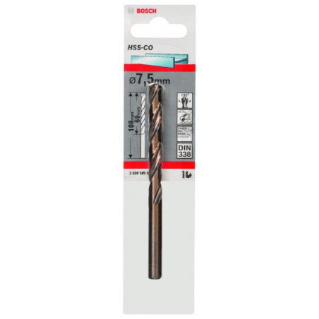Emballage: 1Marque: BoschRéférence: 2608585859EAN: 3165140520942Description: Foret à métaux rectifiés HSS-Co, DIN 338, 7,5 x 69 x 109 mm
