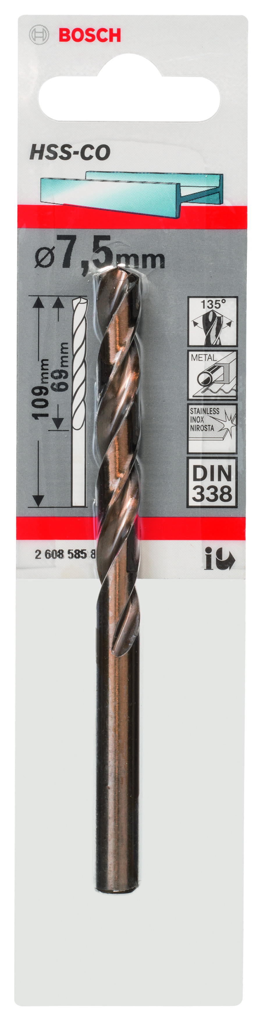 Foret à métaux rectifiés HSS-Co, DIN 338, 7,5 x 69 x 109 mm