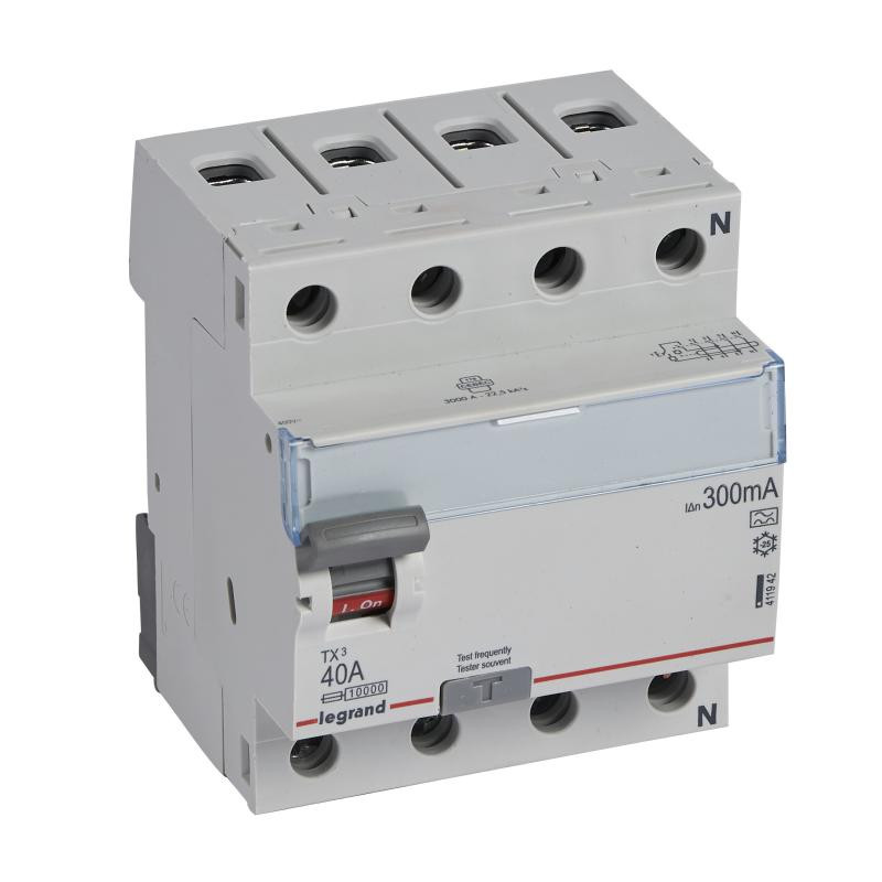Description: Interrupteur différentiel TX³ 4P 300mA 40A Type A - 4 modules - convient pour des installations domestiques