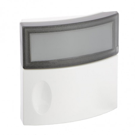Description: Poussoir Salsa avec porte-étiquette - bloc saillie - 24 V - 2 A - IP 44 - IK 06 - classe III - dimensions 70 x 70 x 25 mm - blanc - fixation horizontale