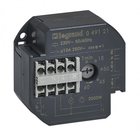 Description: Télérupteur pour boîtes d'encastrement - silencieux - unipolaire avec minuterie - télérupteur 10 AX - 230VAC - 50/60Hz