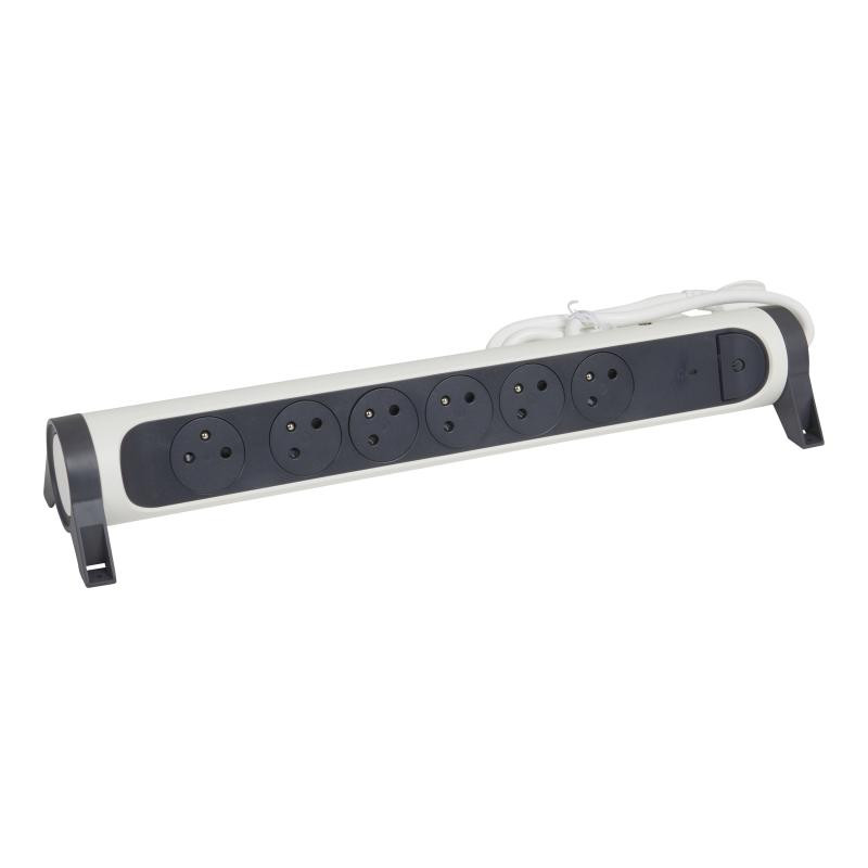 Description: Multiprise premium rotative et fixable 6x2P+T avec minidisjoncteur indicateur de charge câble 1,5m - blanc - noir