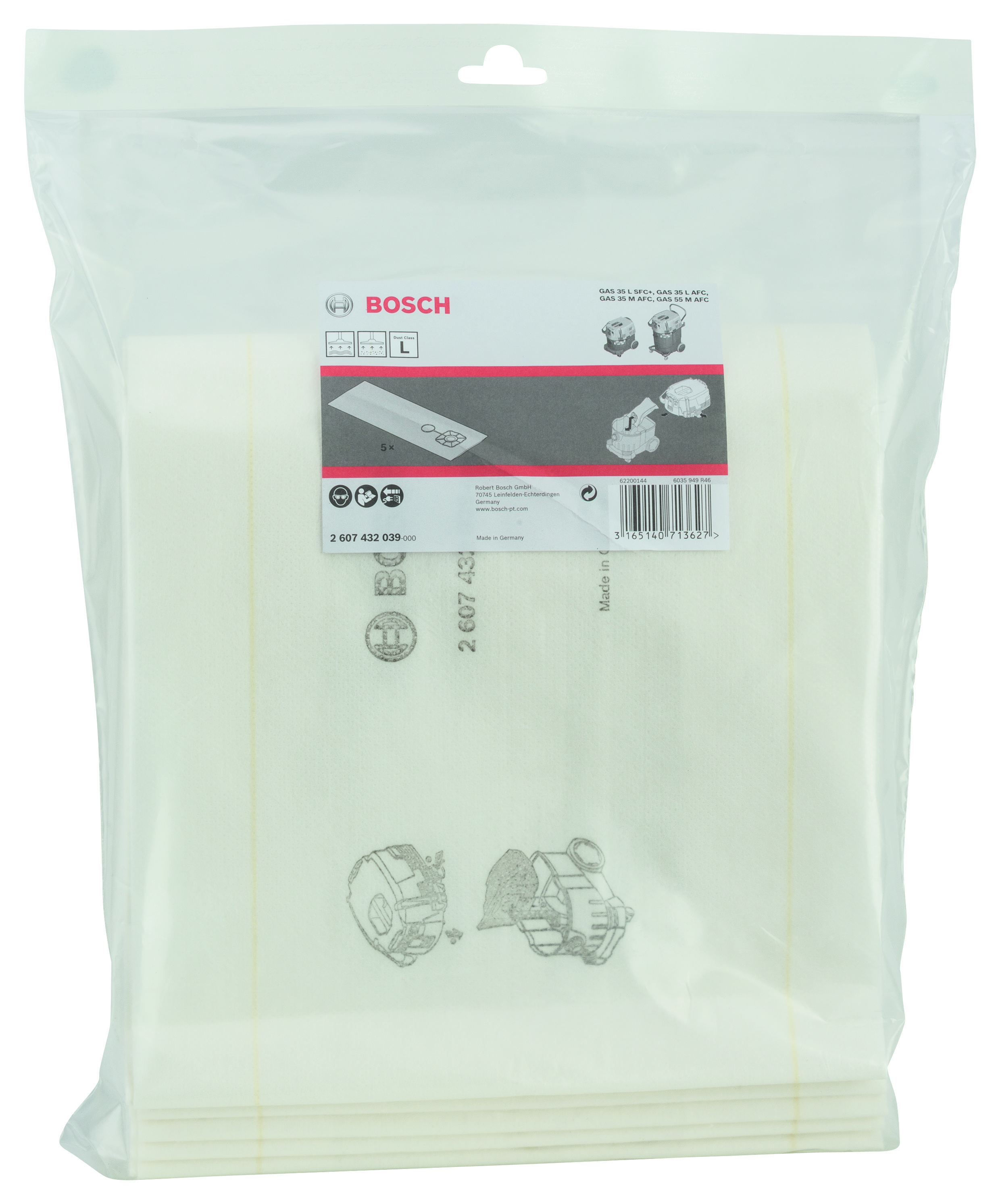 Emballage: 5Marque: BoschRéférence: 2607432039EAN: 3165140713627Description: Sac-filtre pour liquides GAS 35 5x