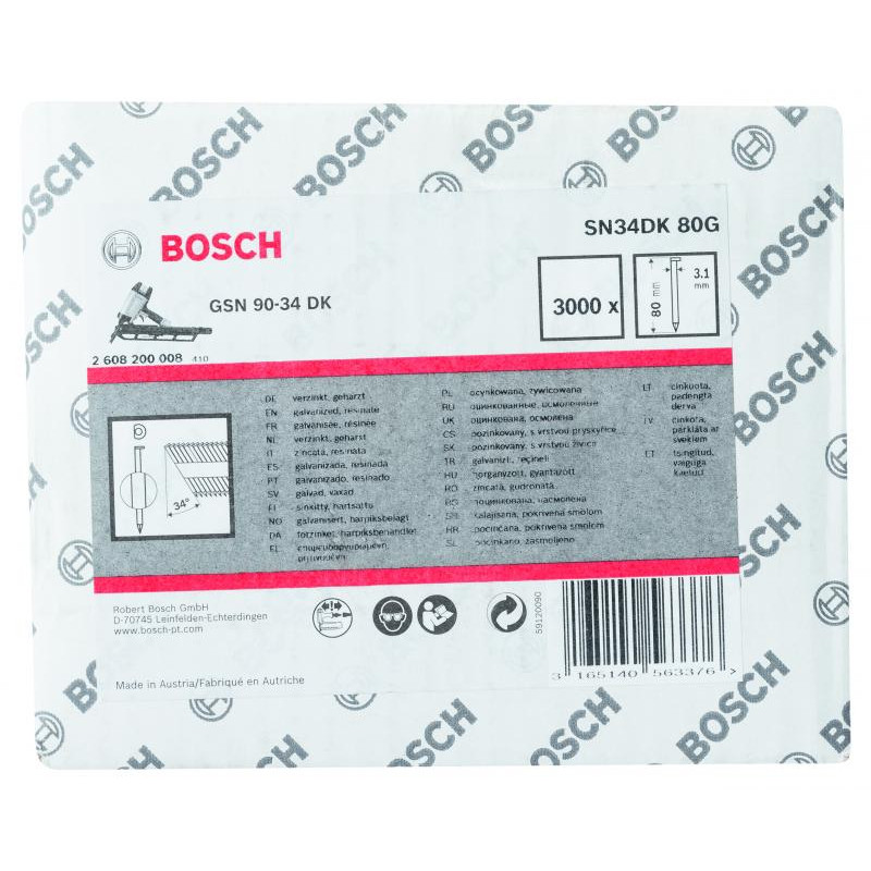 Emballage: 1Marque: BoschRéférence: 2608200008EAN: 3165140563376Description: Clou en bande tête D SN34DK 3,1 x 80 mm, galvanisé, lisse 3000x