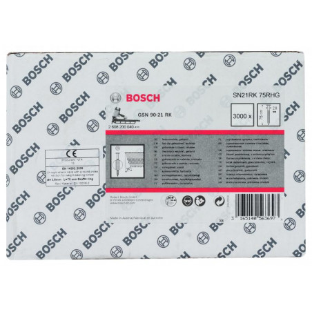 Emballage: 3000 Marque: Bosch Référence: 2608200040 EAN: 3165140563697 Description: Clou en bande tête ronde SN21RK 2,8 x 75 mm, galvanisé à chaud, rainuré 3000x