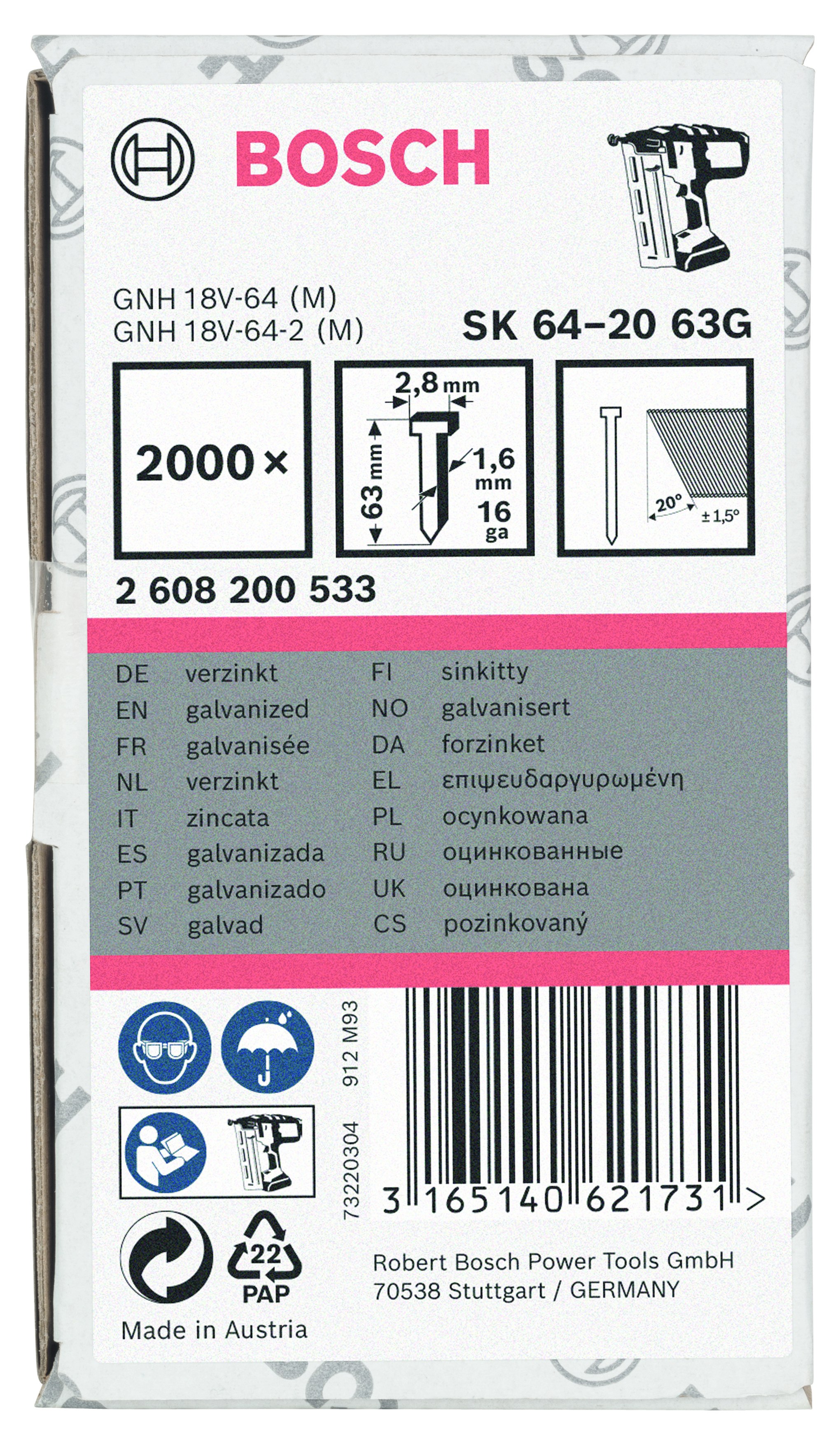 Emballage: 2000Marque: BoschRéférence: 2608200533EAN: 3165140621731Description: Pointe à tête fraisée SK64- 1,8 x 20 x 63 mm, galvanisés 2000x