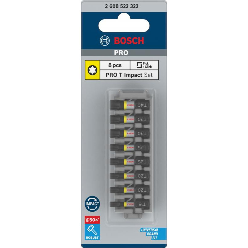 Emballage: 8Marque: BoschRéférence: 2608522322EAN: 3165140851121Description: 8 Embouts de vissage PRO Impact T15 T20(x2) T25(x2) T30(x2) T40 25 mm