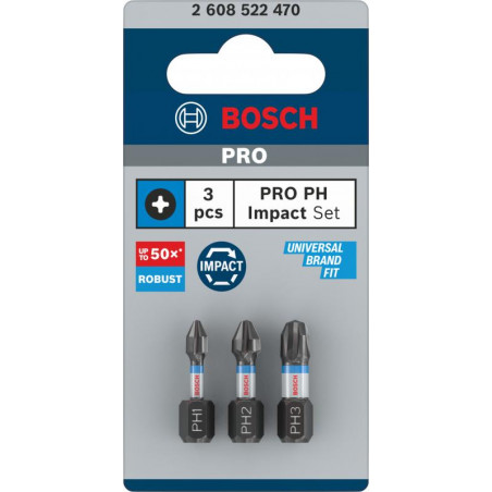 Emballage: 3Marque: BoschRéférence: 2608522470EAN: 6949509233370Description: 3 Embouts de vissage PRO Impact PH1 PH2 PH3 25 mm