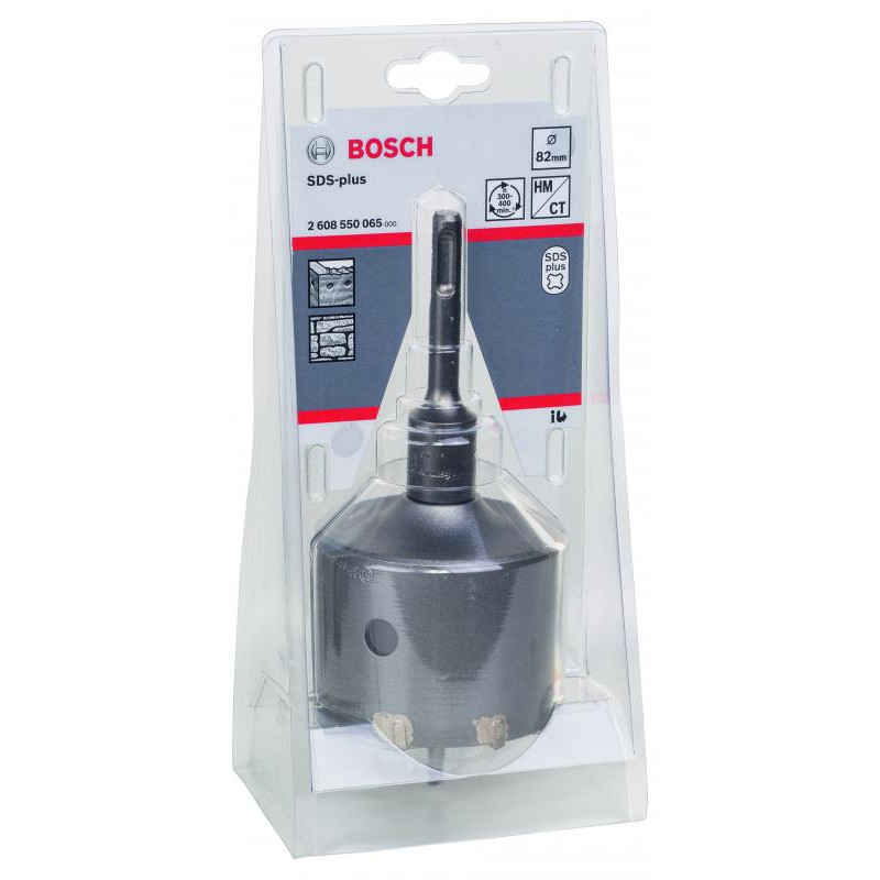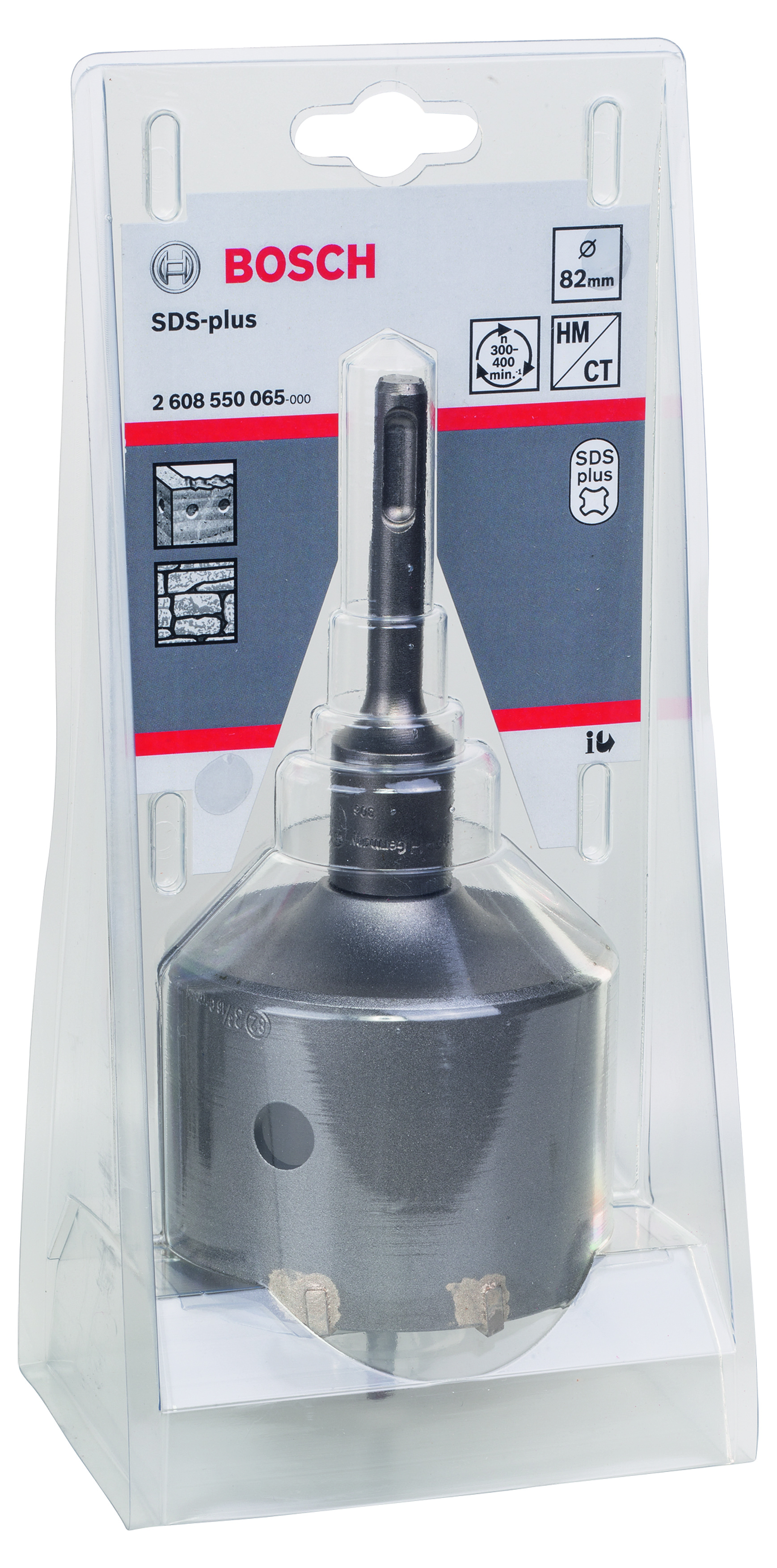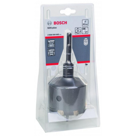 Emballage: 3Marque: BoschRéférence: 2608550065EAN: 3165140046213Description: Trepan PRO SDS plus-5 Core Cutter avec porte-outil 82x54x72 mm