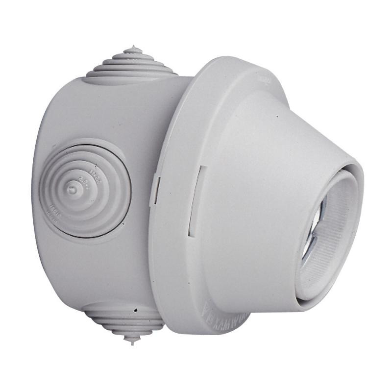 Description: Patère Plexo E27 - IP 20 - 250 V - 4 A - 100 W - douille porcelaine - positionnement droite ou inclinée - livré avec boîte étanche diam. 70 mm et 4 embouts