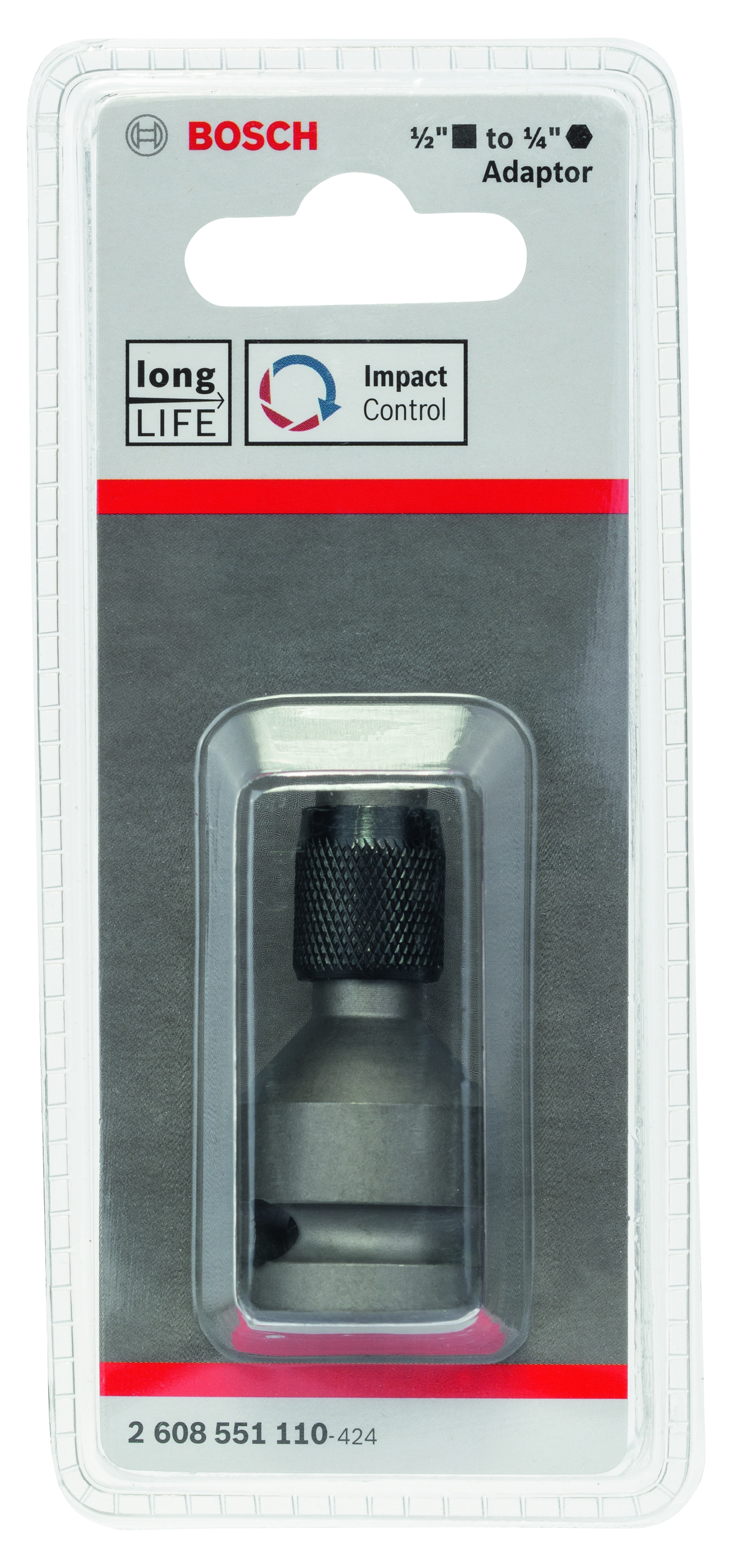 Emballage: 1Marque: BoschRéférence: 2608551110EAN: 6949509247056Description: Adaptateur 1/2'' carre - 1/4'' Hex