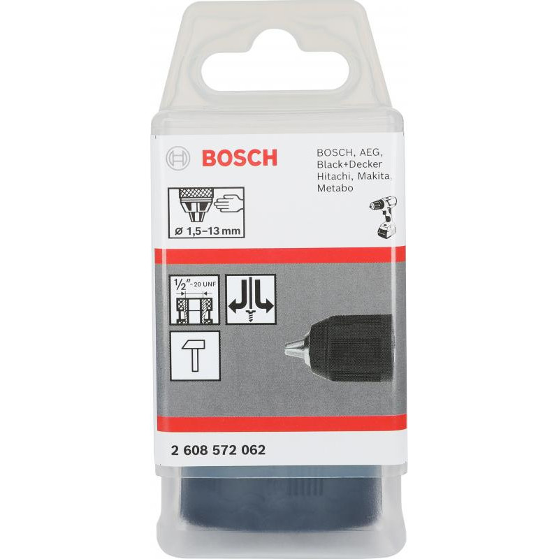 Emballage: 1Marque: BoschRéférence: 2608572062EAN: 3165140082754Description: Mandrin automatique jusquà 2-13 mm, 1/2''- 20