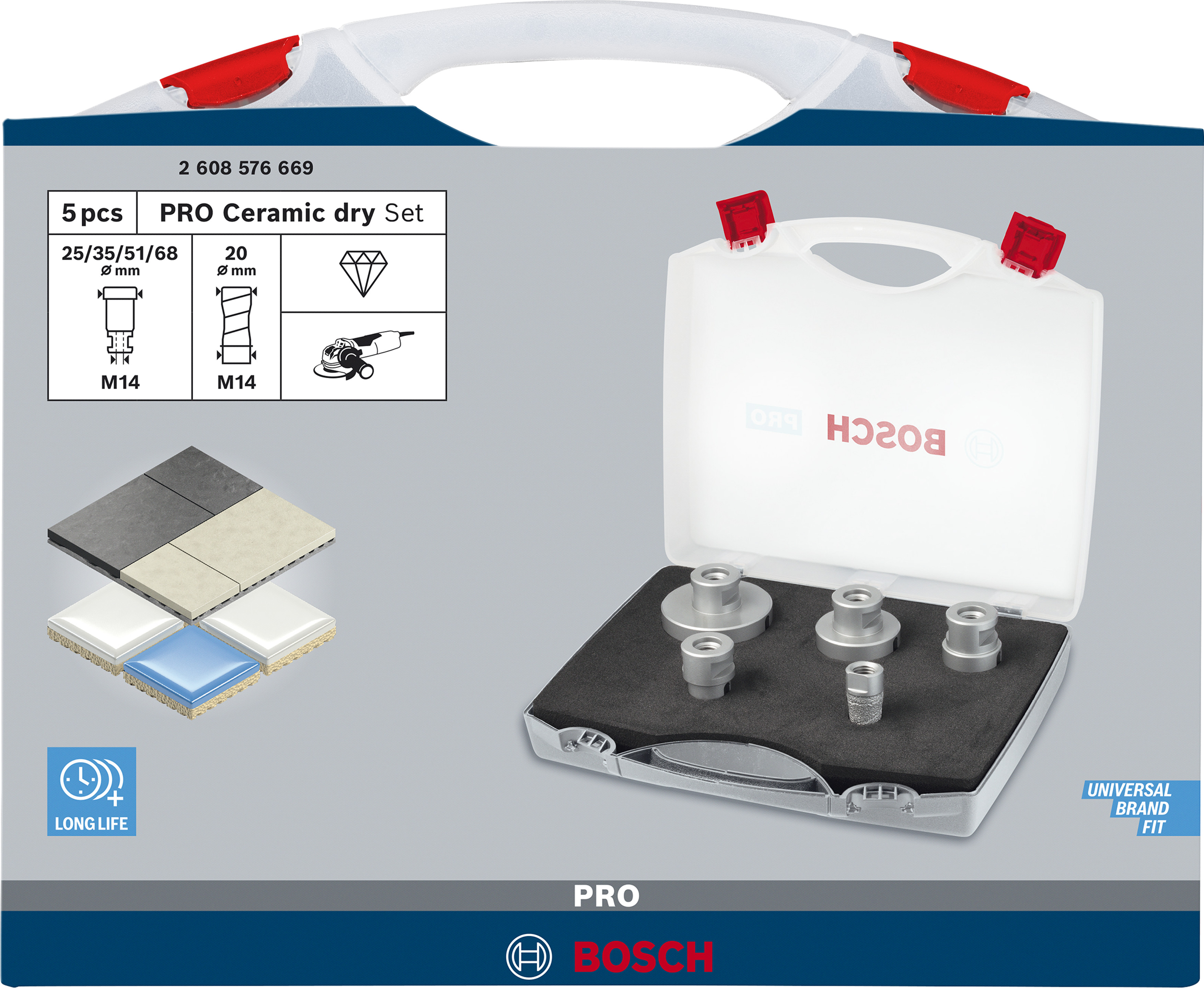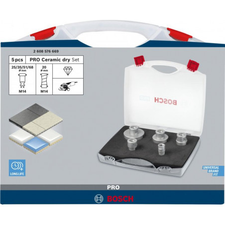 Emballage: 5Marque: BoschRéférence: 2608576669EAN: 3165140888660Description: Coffret 5 trépans diamant PRO Ceramic a sec, 68x33; 51x33; 35x33; 25x33; 20x33mm
