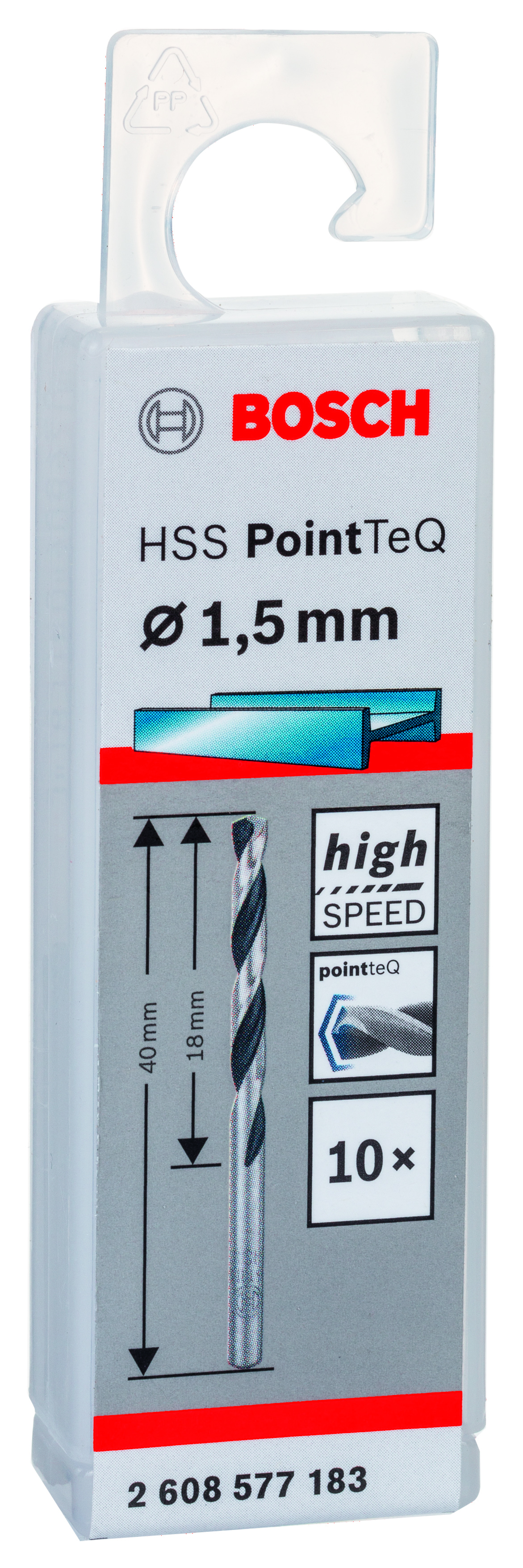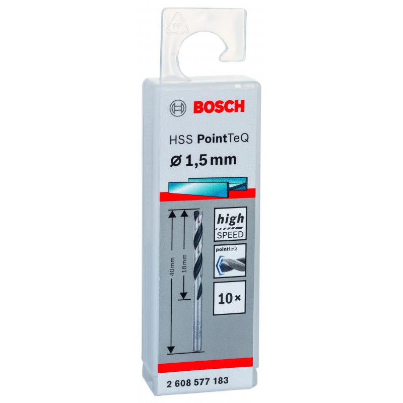 Emballage: 10Marque: BoschRéférence: 2608577183EAN: 3165140906920Description: Foret hélicoïdal HSS PointTeQ 1,5 mm 10x