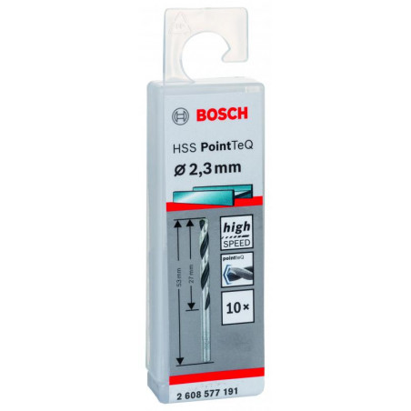 Emballage: 10Marque: BoschRéférence: 2608577191EAN: 3165140907002Description: Foret hélicoïdal HSS PointTeQ 2,3 mm 10x
