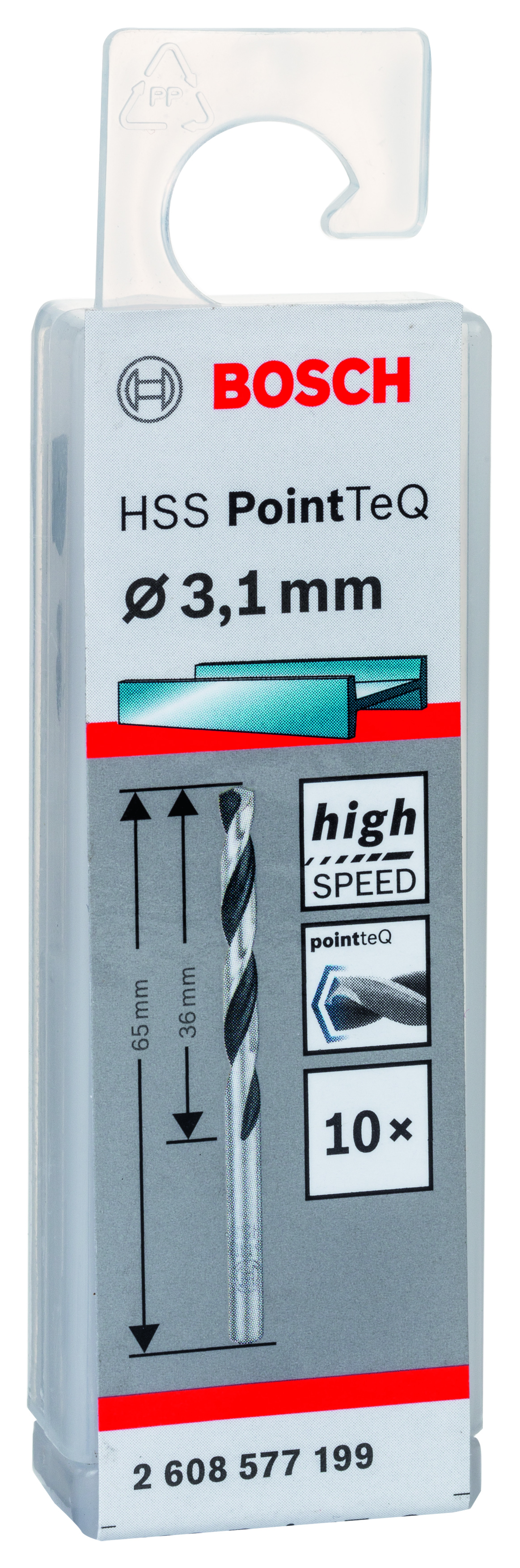 Emballage: 10Marque: BoschRéférence: 2608577199EAN: 3165140907088Description: Foret hélicoïdal HSS PointTeQ 3,1 mm 10x