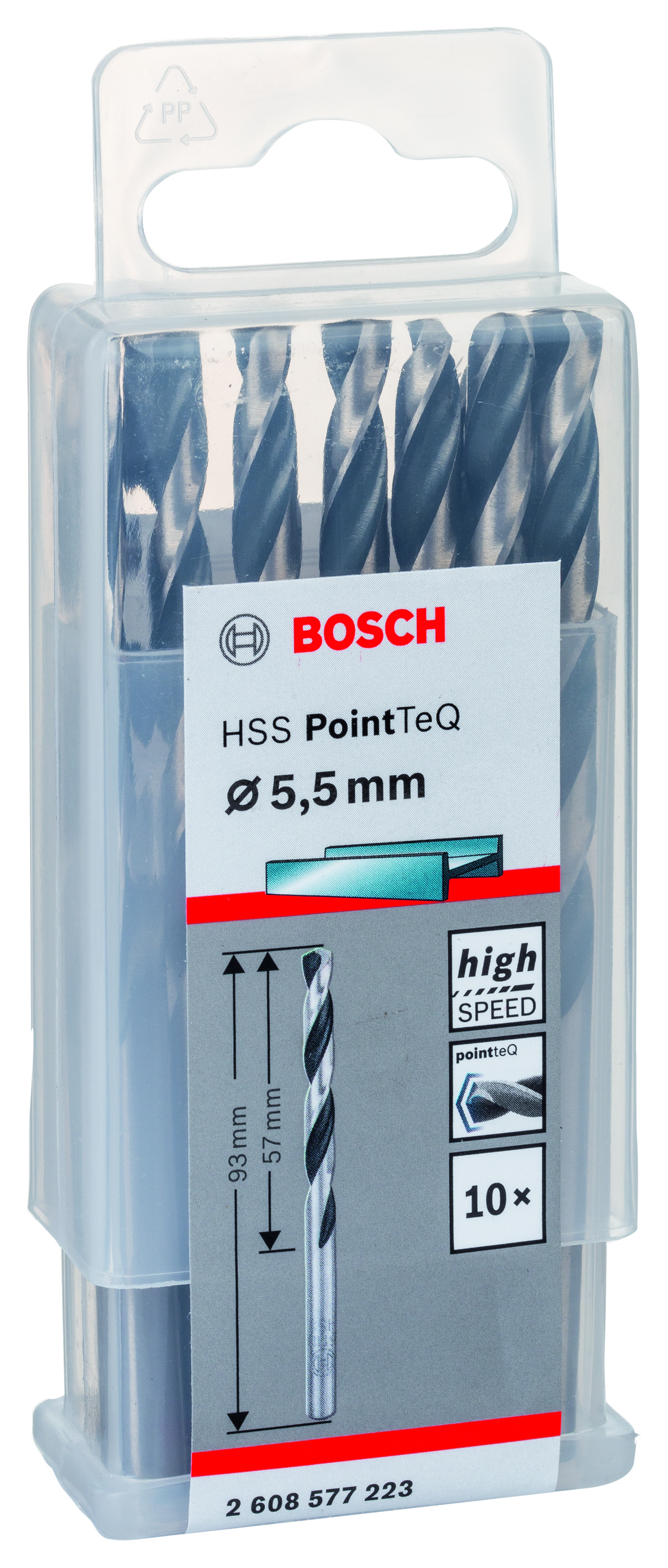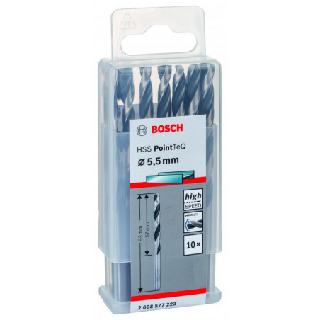 Emballage: 10Marque: BoschRéférence: 2608577223EAN: 3165140907323Description: Foret hélicoïdal HSS PointTeQ 5,5 mm 10x