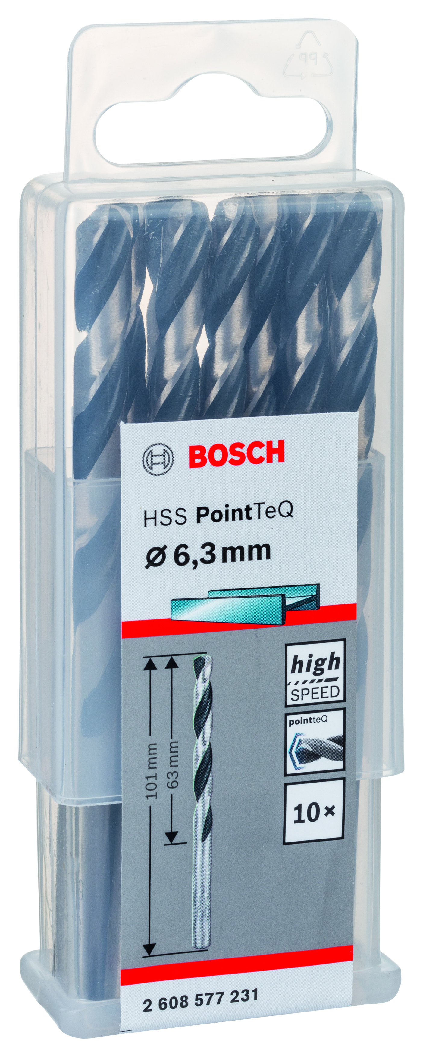 Emballage: 10Marque: BoschRéférence: 2608577231EAN: 3165140907408Description: Foret hélicoïdal HSS PointTeQ 6,3 mm 10x