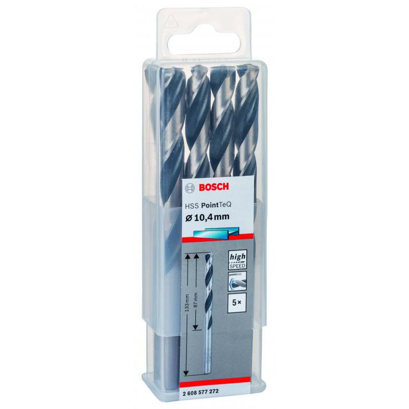 Emballage: 5Marque: BoschRéférence: 2608577272EAN: 3165140907811Description: Foret hélicoïdal HSS PointTeQ 10,4 mm 5x