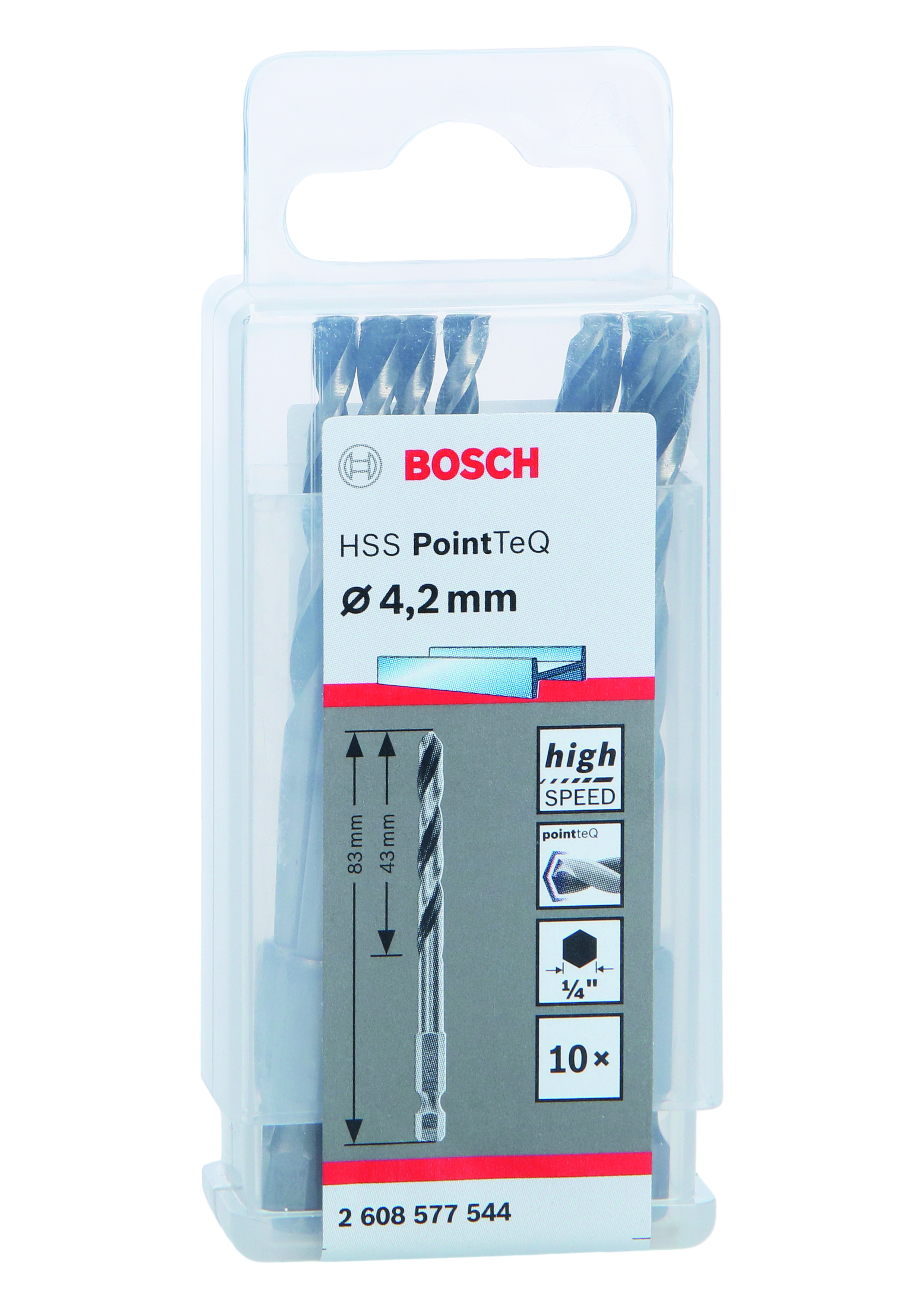 Emballage: 10Marque: BoschRéférence: 2608577544EAN: 6949509231598Description: Foret à métaux HSS PointTeQ 4.2mm, 10st