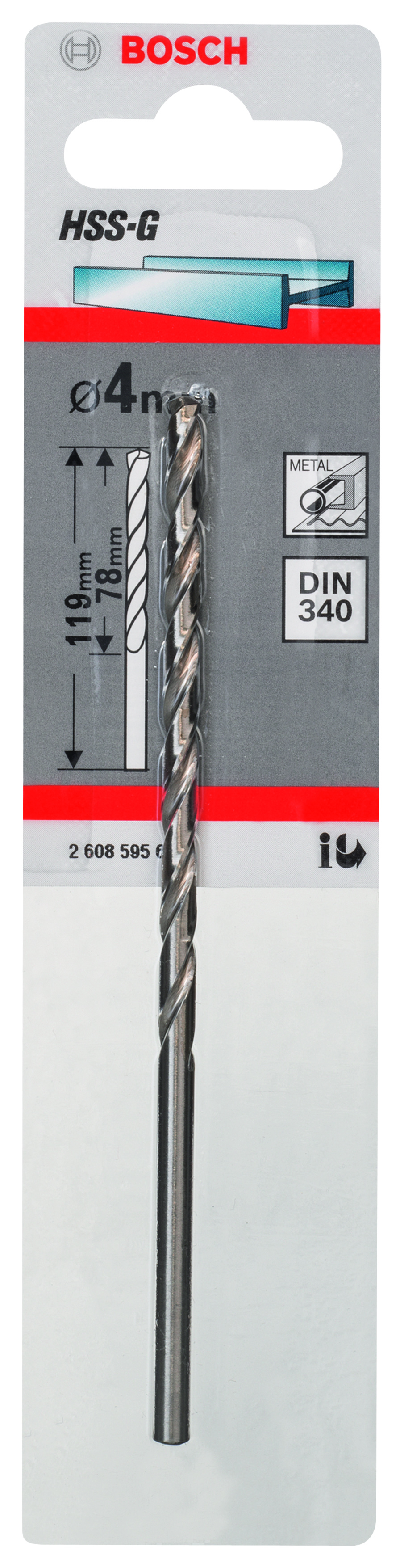 Emballage: 1Marque: BoschRéférence: 2608595679EAN: 3165140417983Description: Foret à métaux rectifiés HSS-G, DIN 340, série longue 4 x 78 x 119 mm