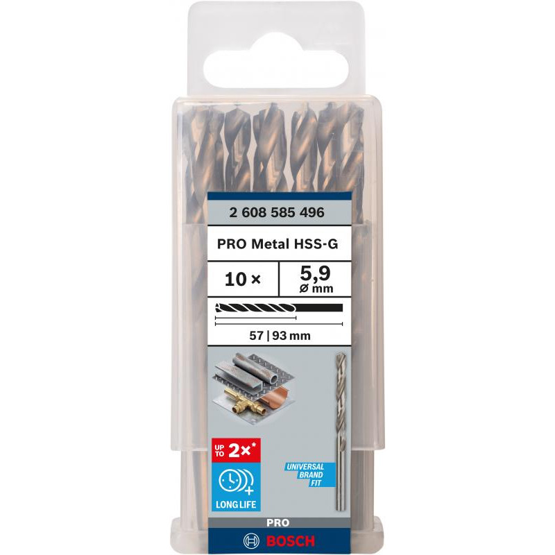 Emballage: 10Marque: BoschRéférence: 2608585496EAN: 3165140475013Description: 10 Forets HSS-G PRO pour le Métal 5.9x57x93 mm
