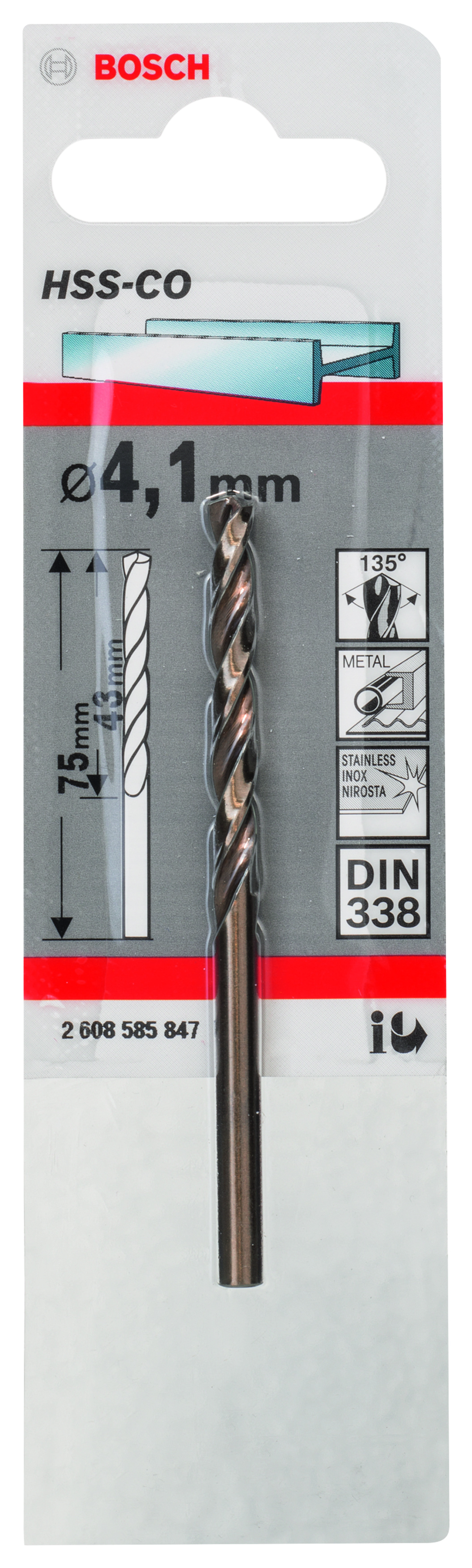Emballage: 1Marque: BoschRéférence: 2608585847EAN: 3165140520829Description: Foret à métaux rectifiés HSS-Co, DIN 338, 4,1 x 43 x 75 mm