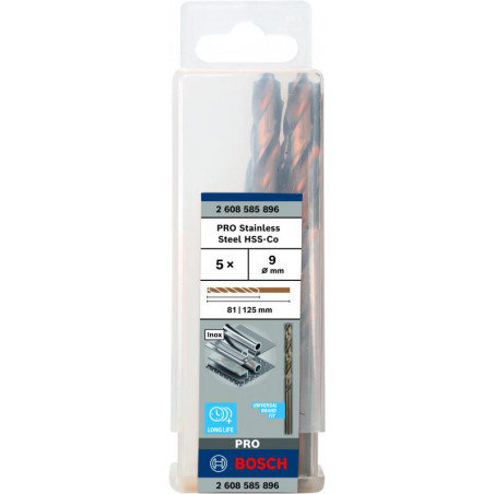 Emballage: 5Marque: BoschRéférence: 2608585896EAN: 3165140521314Description: 5 Forets HSS-Co PRO pour l'Inox 9x81x125 mm