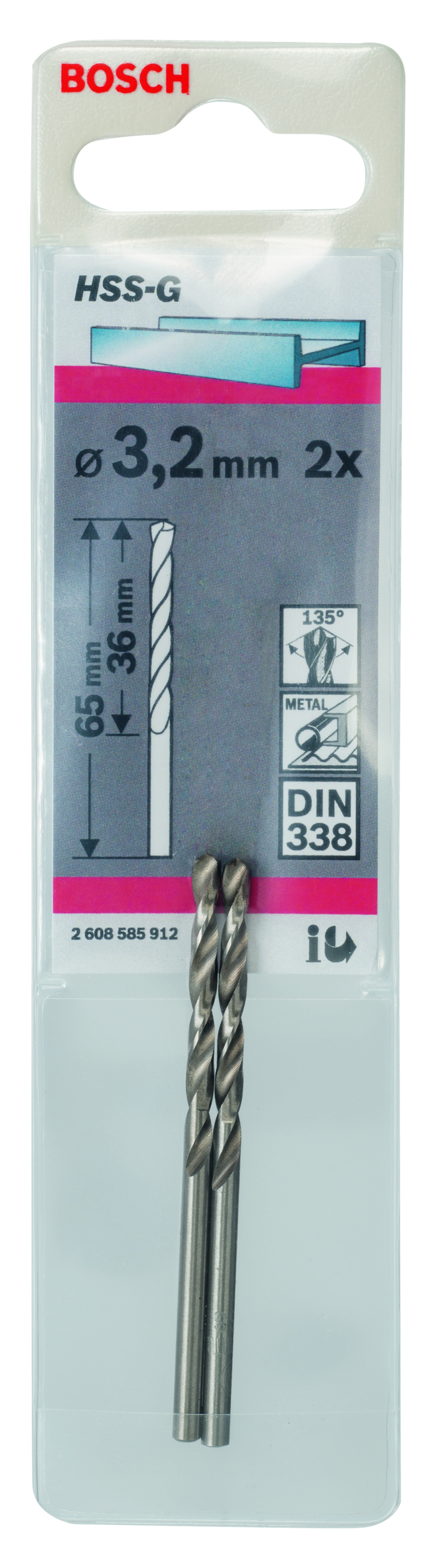 Emballage: 2Marque: BoschRéférence: 2608585912EAN: 3165140521475Description: Foret à métaux rectifiés HSS-G, DIN 338, 3,2 x 36 x 65 mm 2x