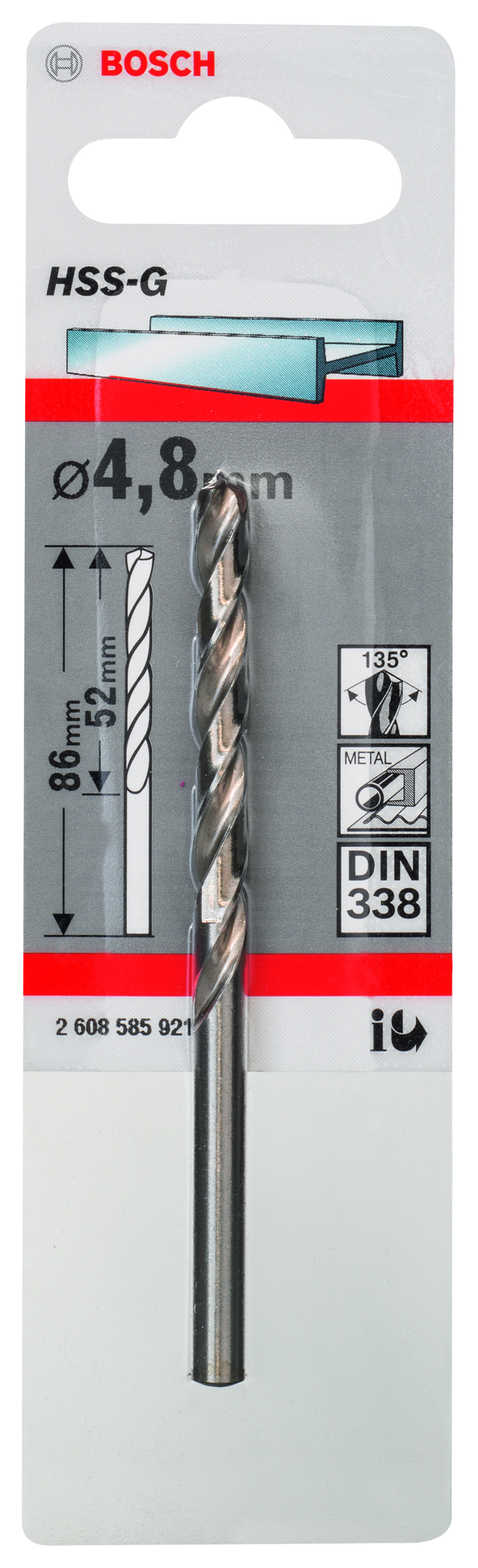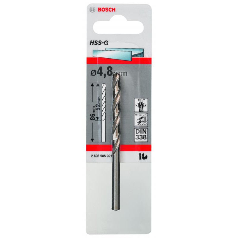 Emballage: 1Marque: BoschRéférence: 2608585921EAN: 3165140521567Description: Foret à métaux rectifiés HSS-G, DIN 338, 4,8 x 52 x 86 mm