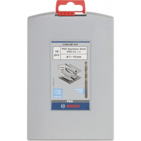 Emballage: 19Marque: BoschRéférence: 2608587014EAN: 3165140689786Description: Coffret 19 forets pour Inox PRO HSS-Co 1-10 mm