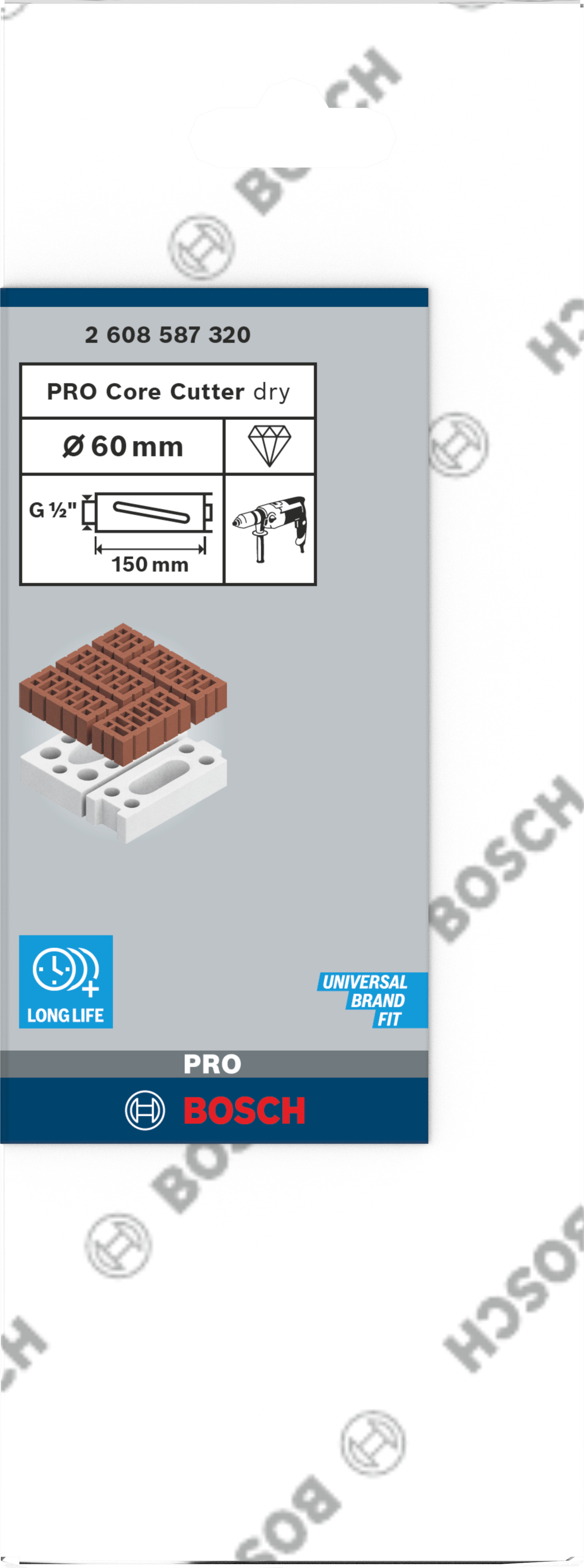 Emballage: 1Marque: BoschRéférence: 2608587320EAN: 3165140623834Description: Couronne diamant a sec PRO 60x150 mm G 1/2''