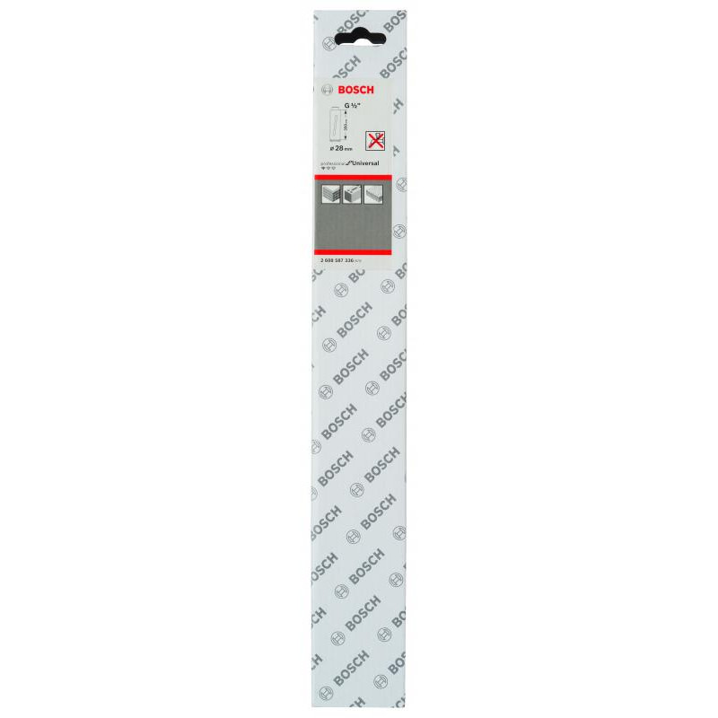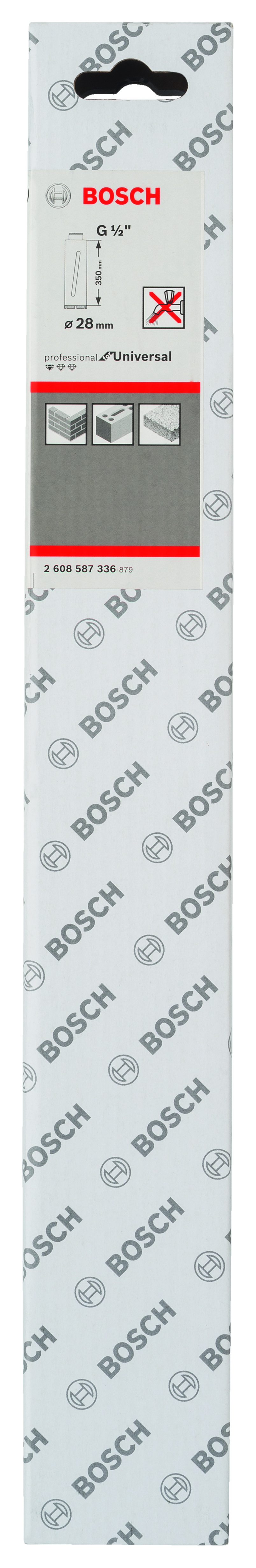 Emballage: 1 Marque: Bosch Référence: 2608587336 EAN: 3165140623995 Description: Couronne de forage à sec diamantée G 1/2'' 28 x 350 x 7 mm, 3 segments