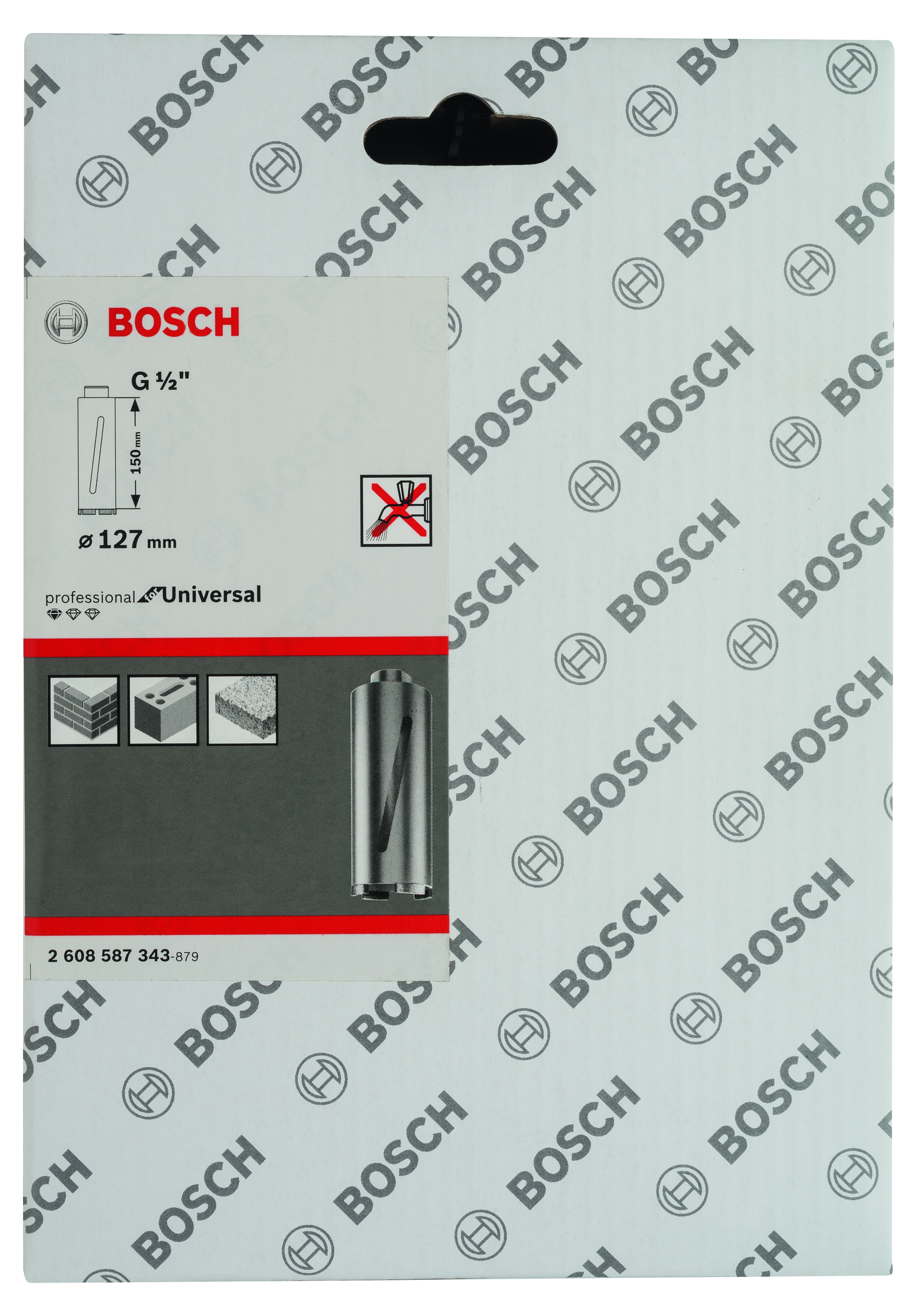 Emballage: 1 Marque: Bosch Référence: 2608587343 EAN: 3165140624060 Description: Couronne de forage à sec diamantée G 1/2'' 127 x 150 x 7 mm, 6 segments