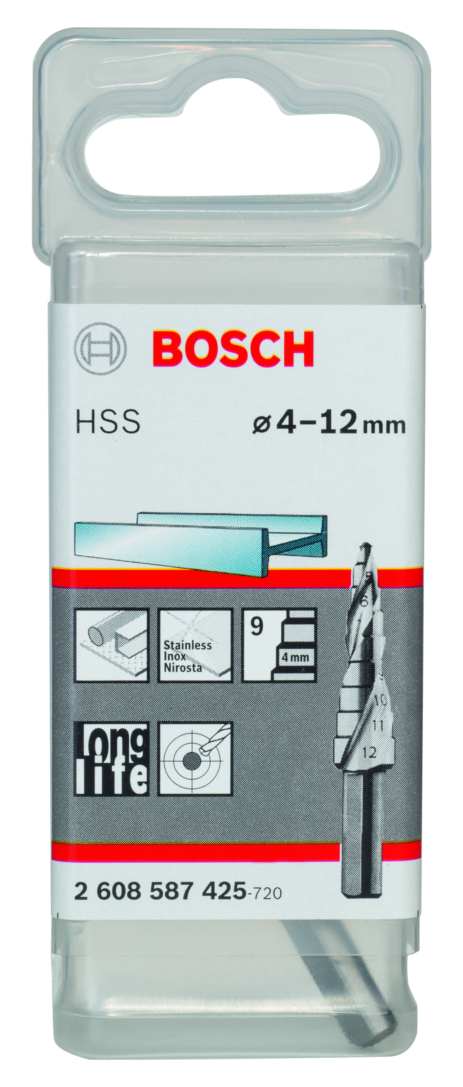 Emballage: 1Marque: BoschRéférence: 2608587425EAN: 3165140630191Description: Fraise étagée HSS 4-12, 6 x 66,5 mm