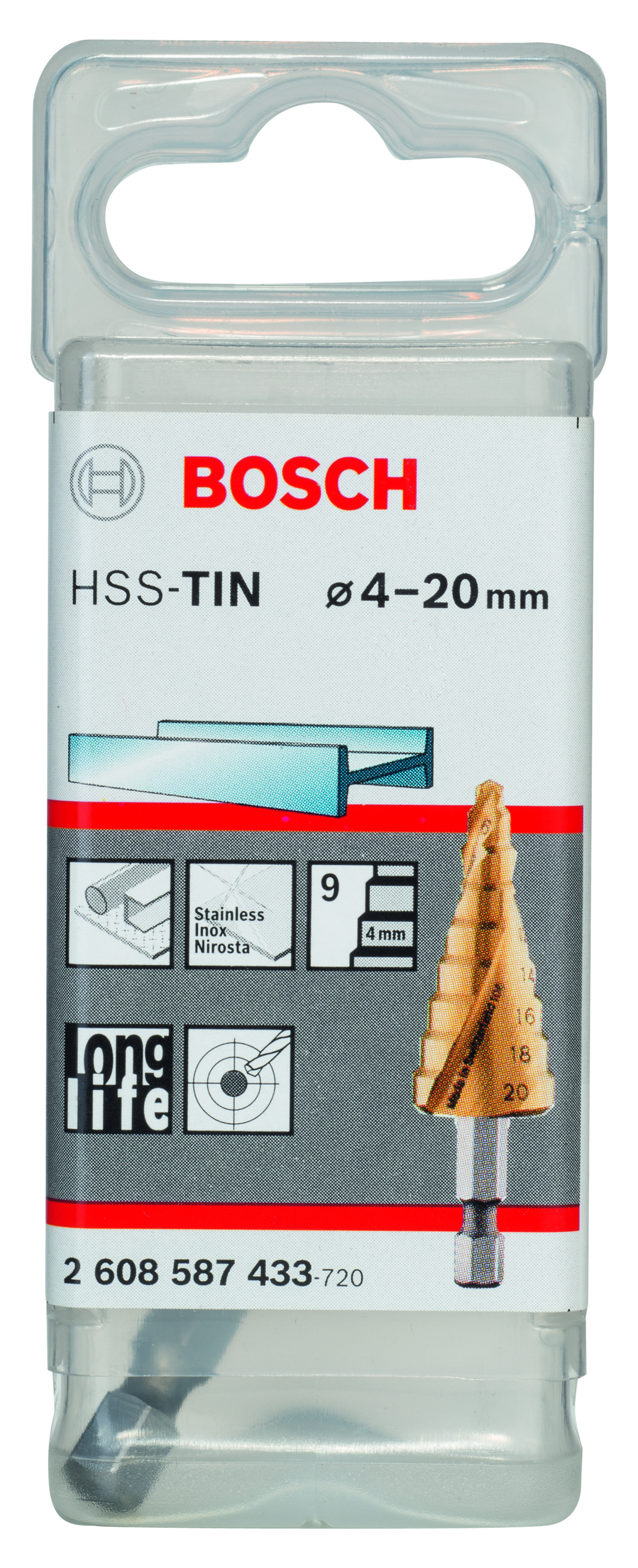 Emballage: 1Marque: BoschRéférence: 2608587433EAN: 3165140630276Description: Fraise étagée HSS-TiN 4-20, 70,5 mm