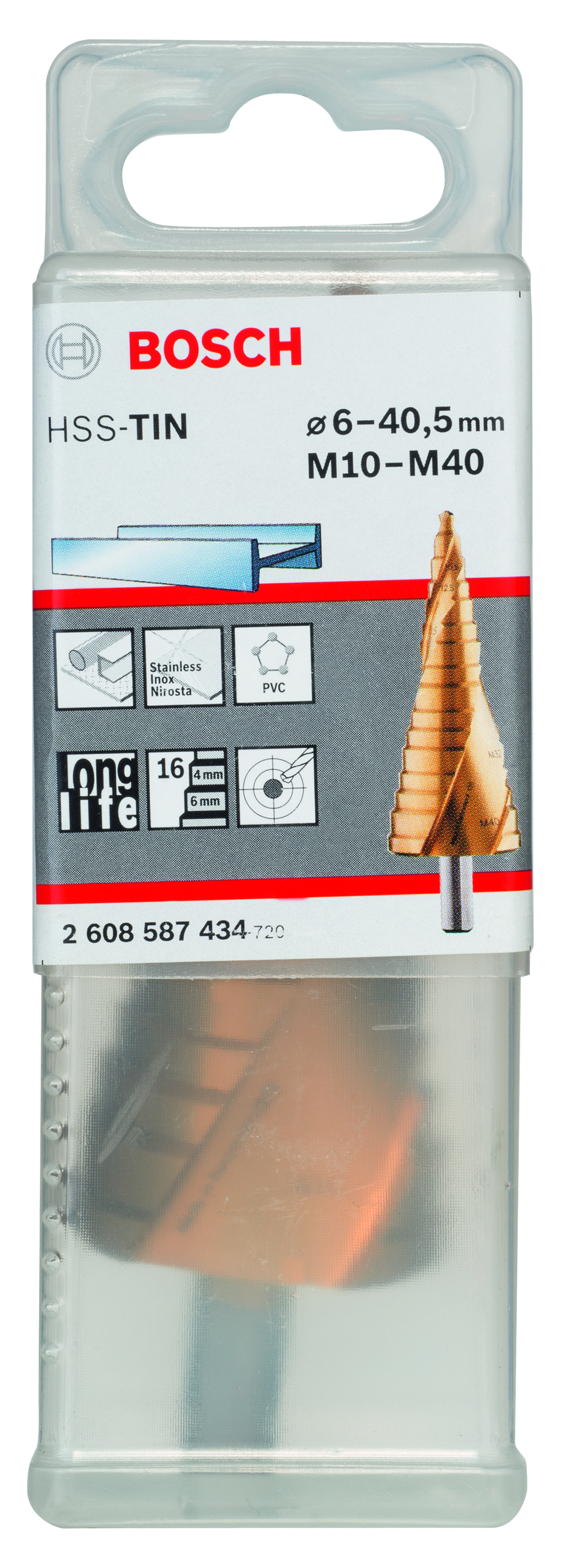 Emballage: 1Marque: BoschRéférence: 2608587434EAN: 3165140630283Description: Fraise étagée HSS-TiN 10-40, 10 x 125,5 mm