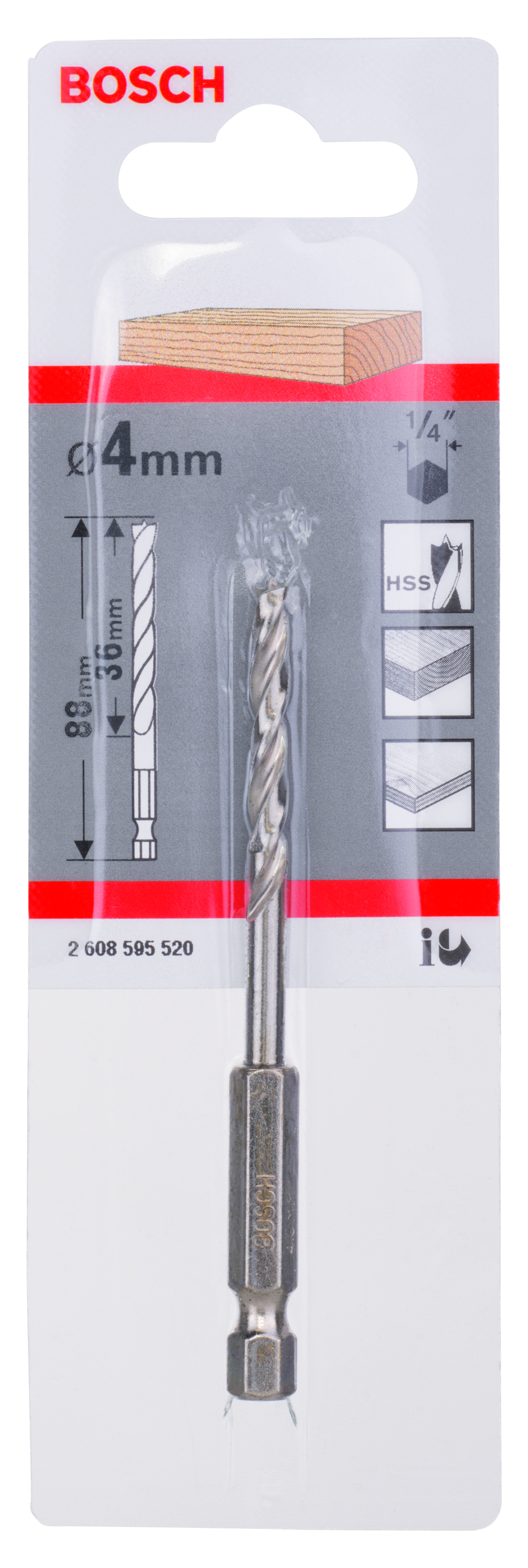 Emballage: 1Marque: BoschRéférence: 2608595520EAN: 3165140395458Description: Mèche à bois hélicoïdale, queue six pans 1/4'' 4 x 43 x 88 mm