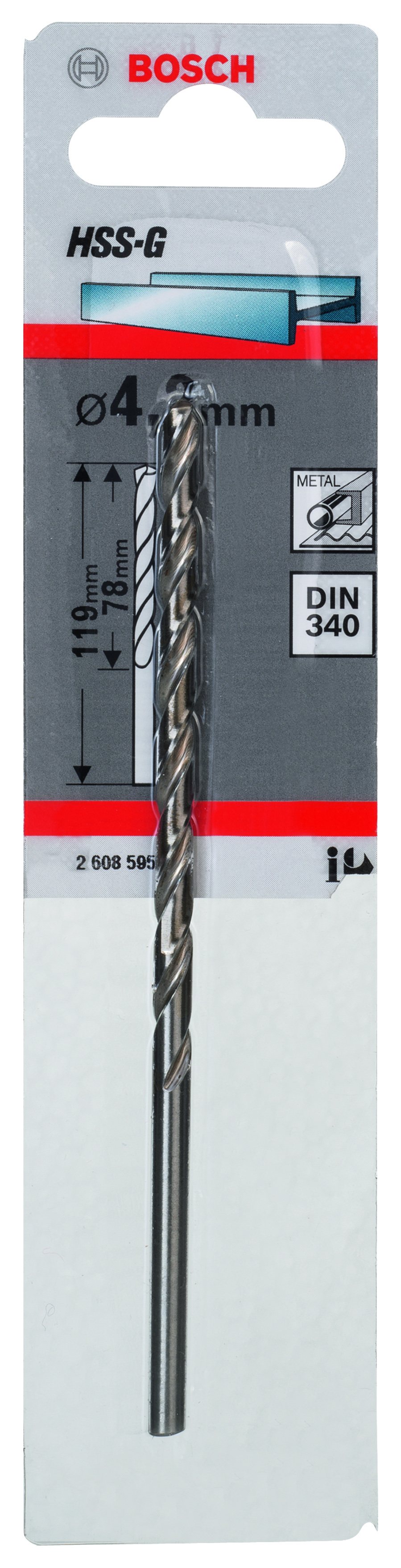 Emballage: 1 Marque: Bosch Référence: 2608595680 EAN: 3165140417990 Description: Foret à métaux rectifiés HSS-G, DIN 340, série longue 4,2 x 78 x 119 mm