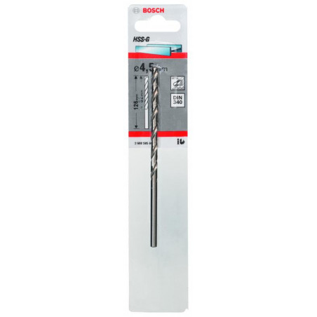 Emballage: 1 Marque: Bosch Référence: 2608595681 EAN: 3165140418003 Description: Foret à métaux rectifiés HSS-G, DIN 340, série longue 4,5 x 82 x 126 mm