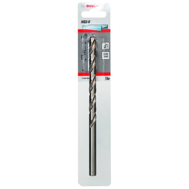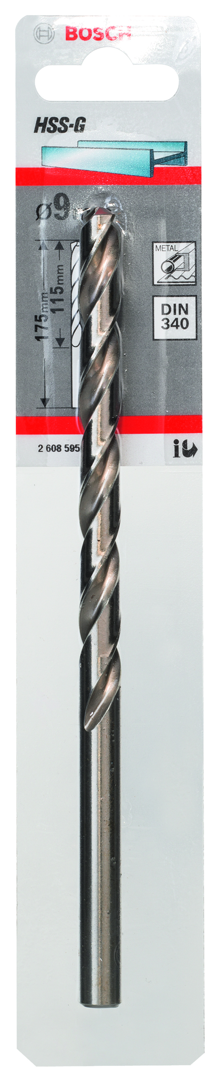 Emballage: 1 Marque: Bosch Référence: 2608595689 EAN: 3165140418089 Description: Foret à métaux rectifiés HSS-G, DIN 340, série longue 9 x 115 x 175 mm