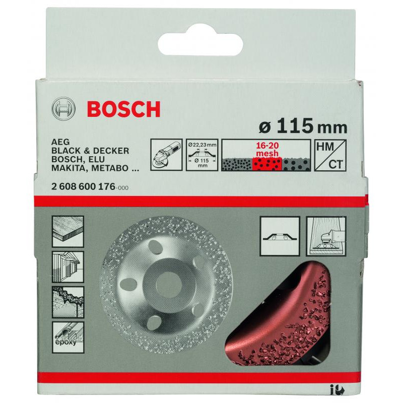 Emballage: 1Marque: BoschRéférence: 2608600176EAN: 3165140103831Description: Meule assiette au carbure moyen, surface plate, 115 x 22,23 mm
