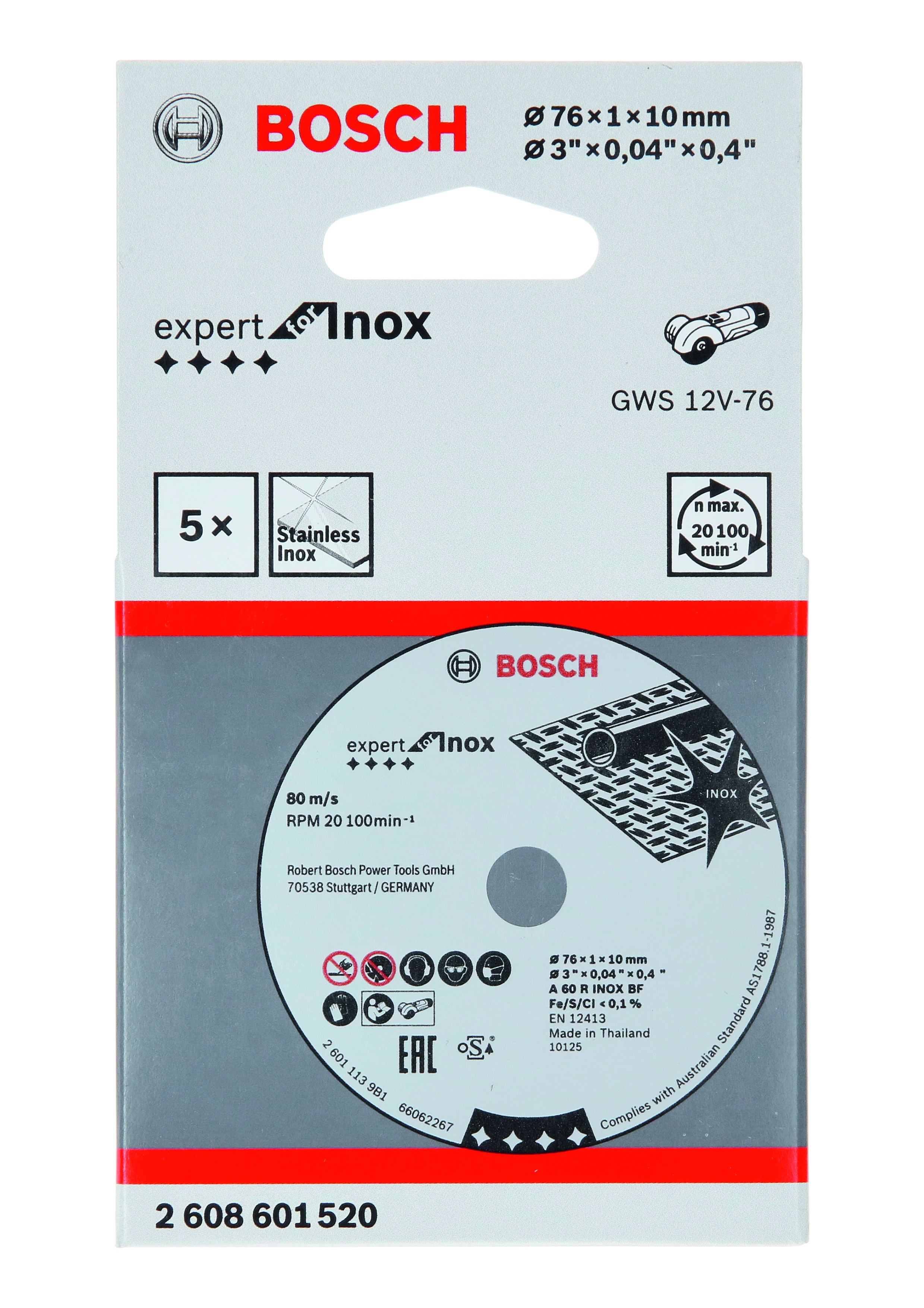 Emballage: 5Marque: BoschRéférence: 2608601520EAN: 3165140830560Description: 5 Disques à tronçonner PRO pour le Métal et l'Inox 76x1x10 mm