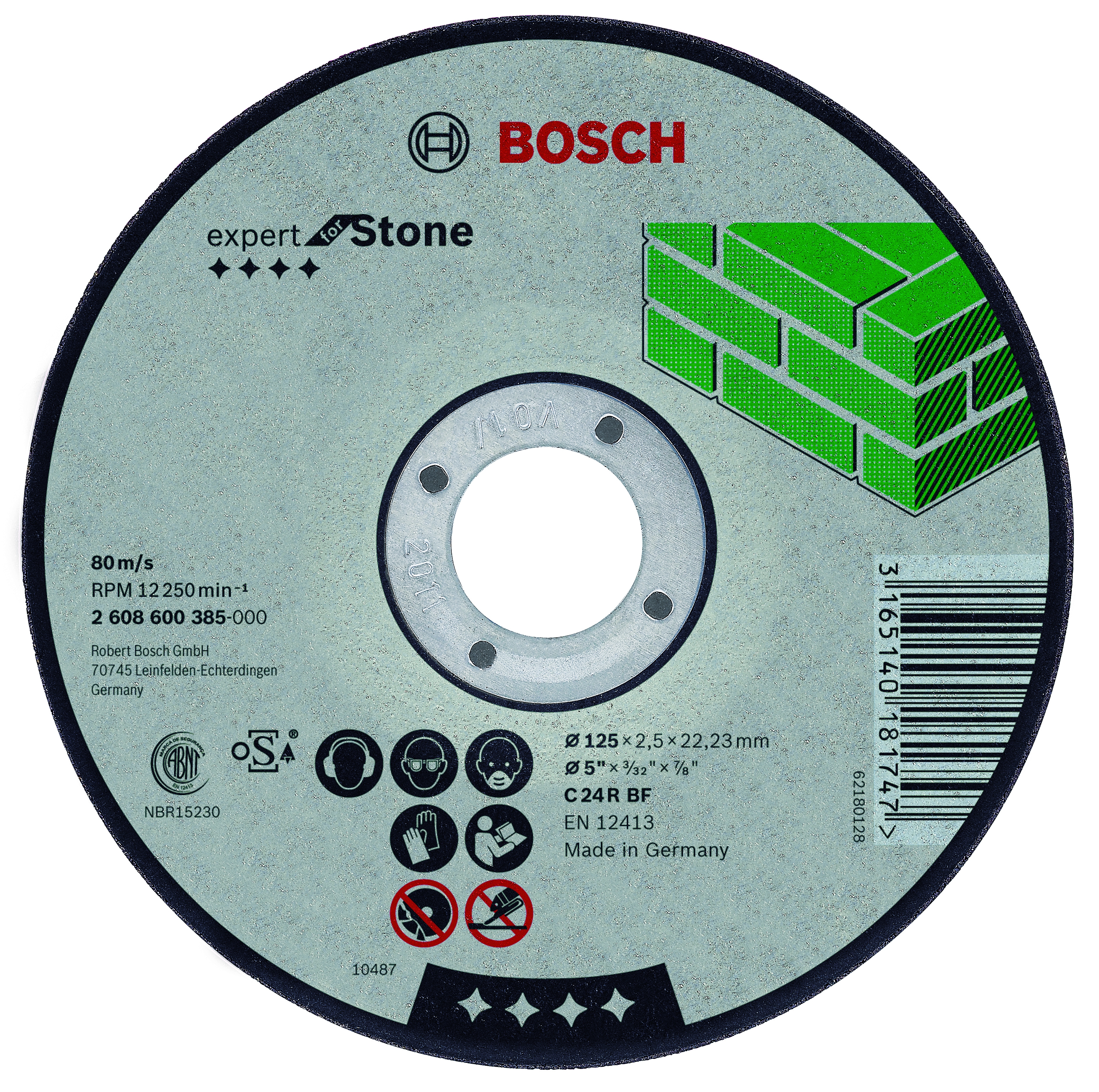 Emballage: 1 Marque: Bosch Référence: 2608600385 EAN: 3165140181747 Description: Disque à tronçonner à moyeu plat, Expert for Stone C 24 R, 125 x 2,5 mm