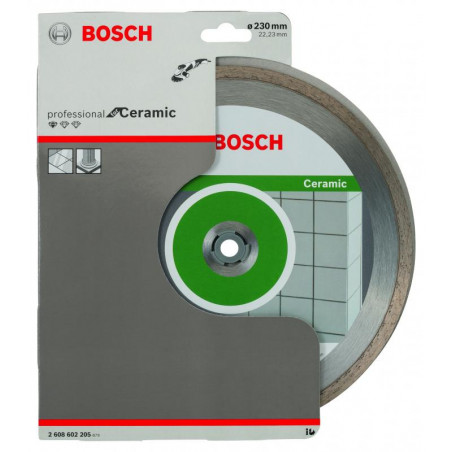 Emballage: 1 Marque: Bosch Référence: 2608602205 EAN: 3165140441339 Description: Disque à tronçonner diamanté Standard for Ceramic 230 x 22,23 x 1,6 x 7 mm