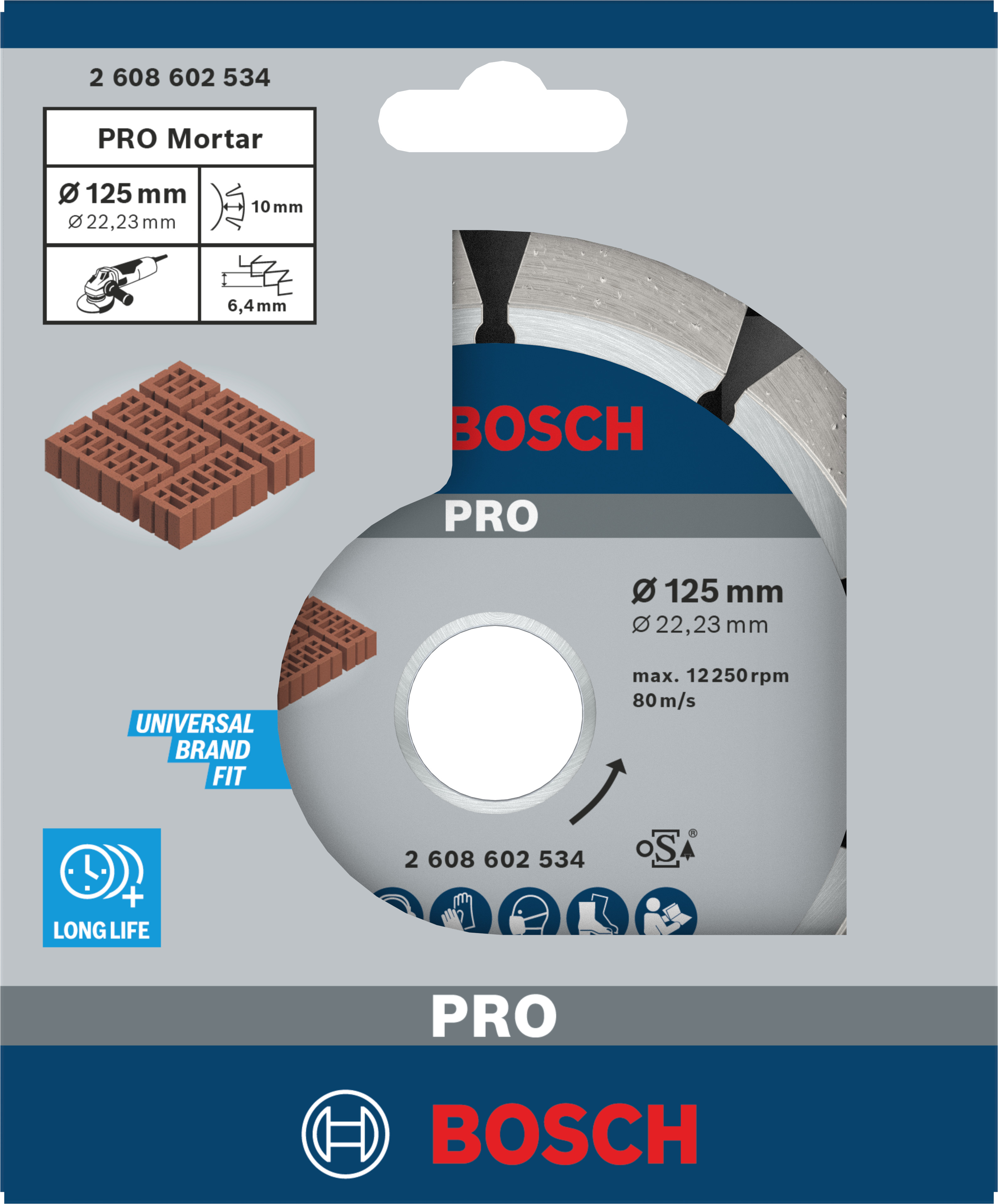 Emballage: 1Marque: BoschRéférence: 2608602534EAN: 3165140572248Description: Disque diamant à déjointer PRO Mortar 125x22,23 mm