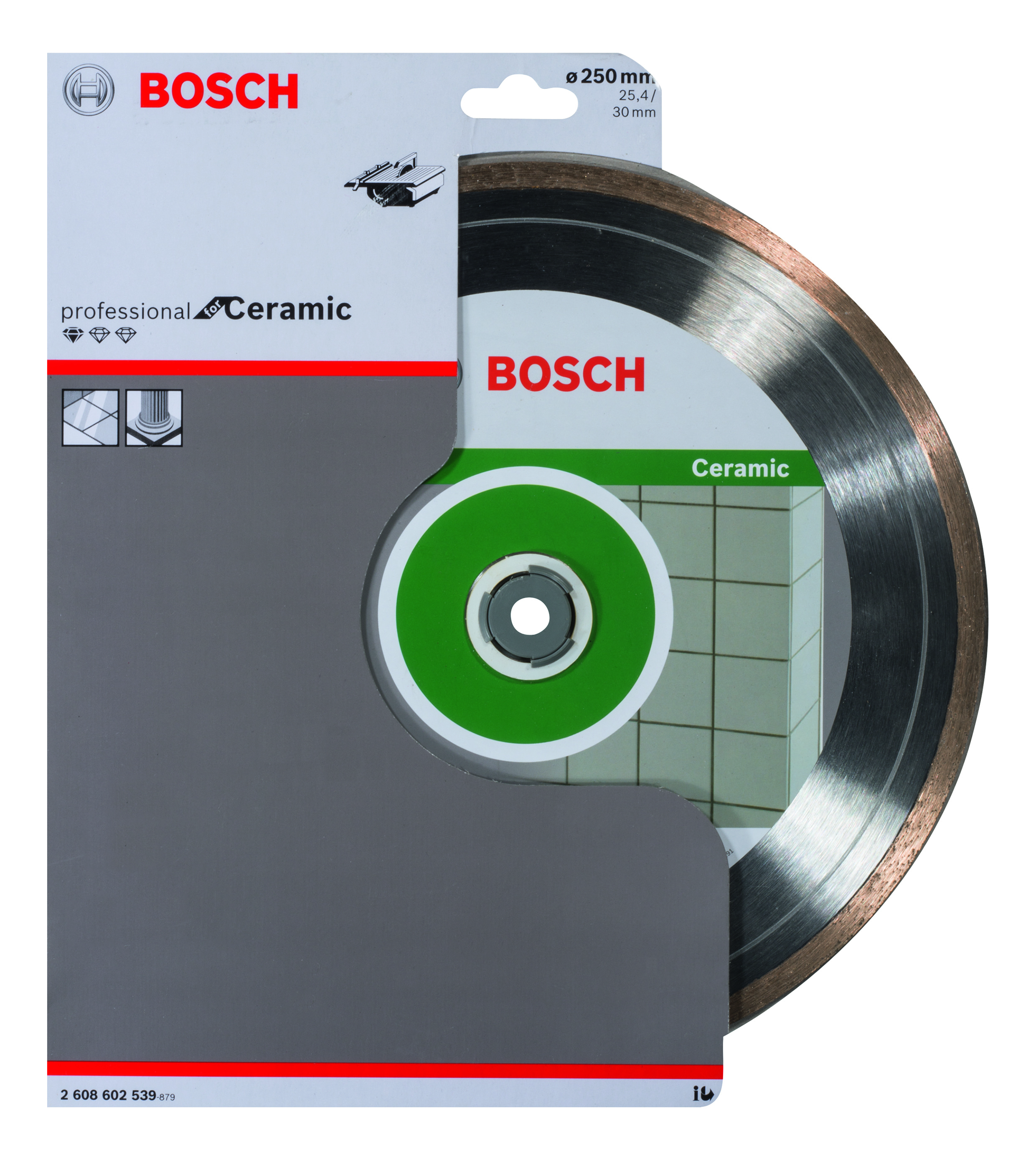 Emballage: 1 Marque: Bosch Référence: 2608602539 EAN: 3165140576437 Description: Disque à tronçonner diamanté Standard for Ceramic 250 x 30/25,40 x 1,6 x 7 mm