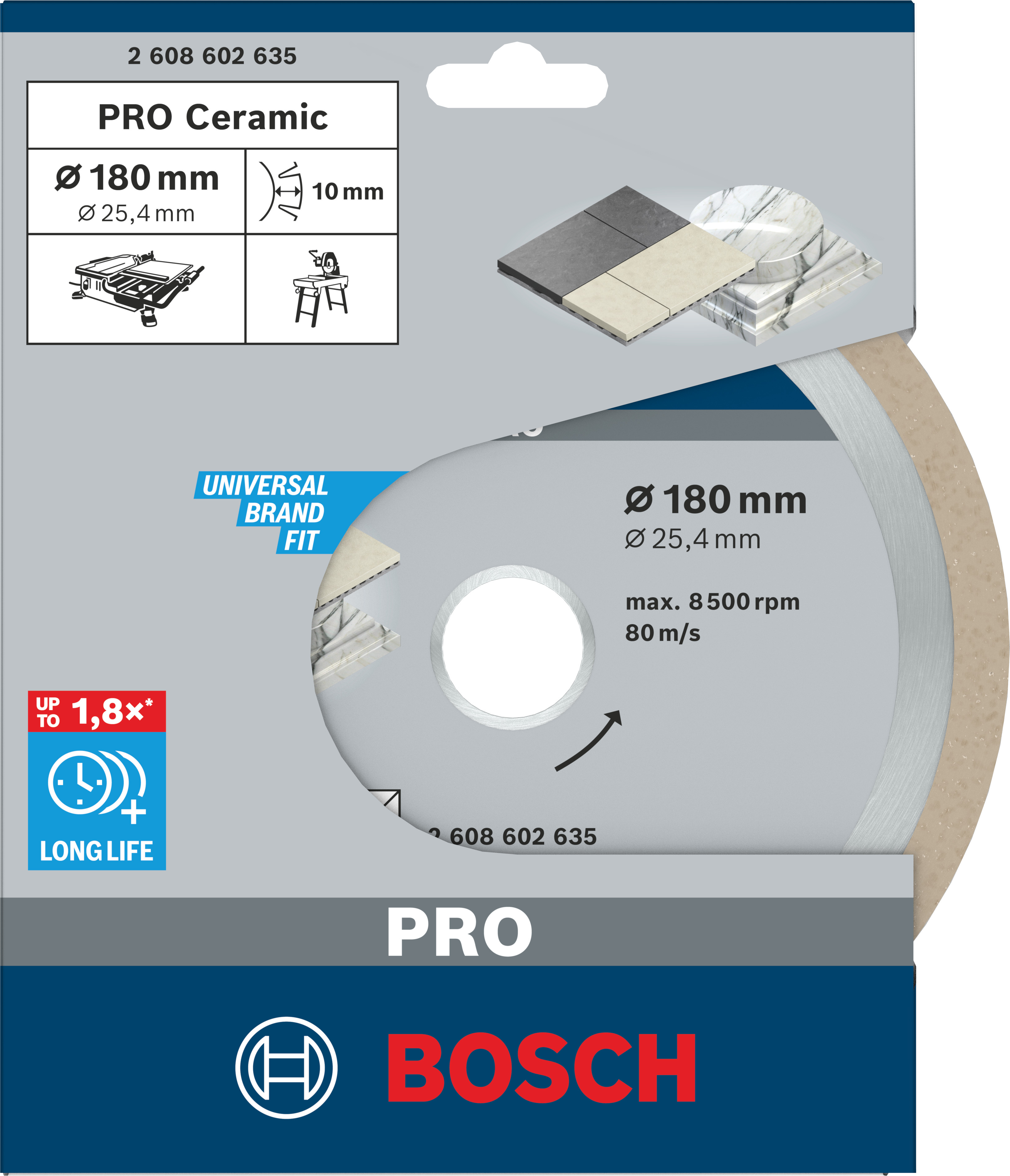 Emballage: 1Marque: BoschRéférence: 2608602635EAN: 3165140581417Description: Disque diamant PRO Ceramic 180x25,4 mm