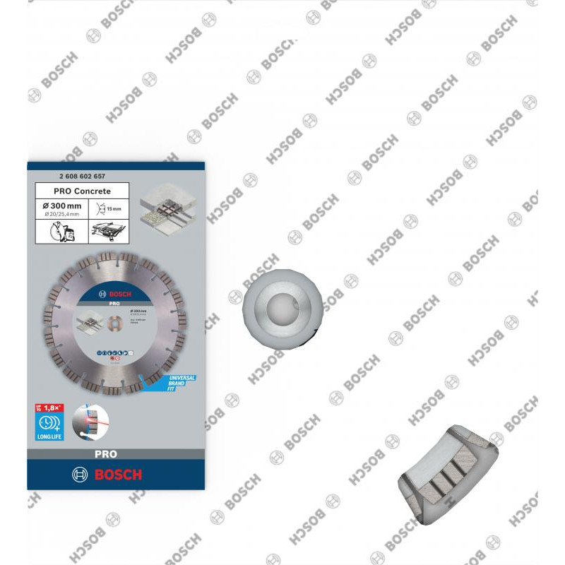 Emballage: 1Marque: BoschRéférence: 2608602657EAN: 3165140581639Description: Disque diamant PRO Beton 300x20/25,4 mm