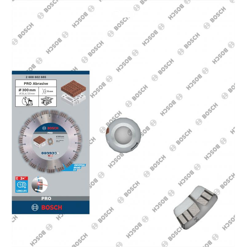Emballage: 1Marque: BoschRéférence: 2608602685EAN: 3165140581912Description: Disque diamant PRO Abrasive 300x20/25,4 mm